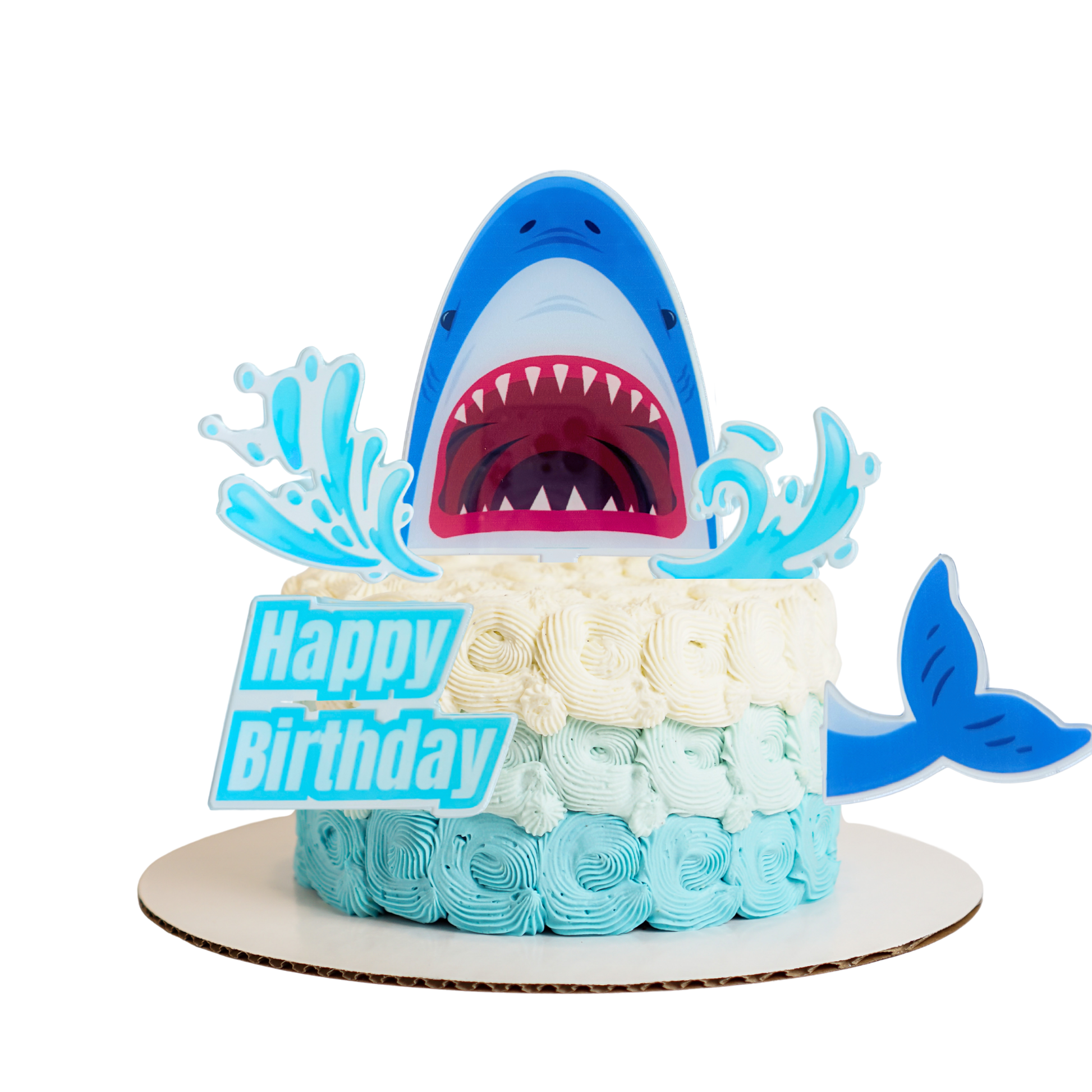 Make a splash at your celebration with this bold and fun shark-themed cake topper set! Featuring a fearsome shark, splashing water, a cheerful "Happy Birthday" sign, and a dynamic tail fin, this set is the perfect way to elevate an under-the-sea or ocean-themed birthday cake.