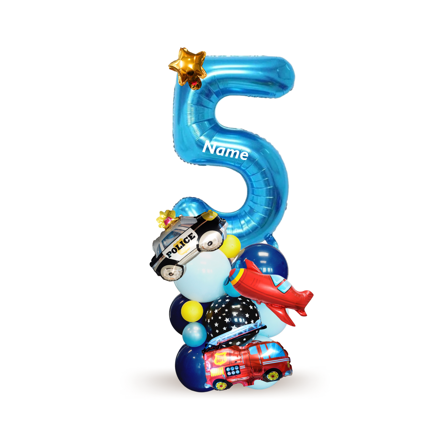 Pack includes: 12-pack 12" latex balloons in dark blue, pastel blue, black star print, 1-pack 40" blue number balloon, 4-pack 5" mixed yellow, blue balloon, 3-pack small foil balloon(fire engine, police car and air plane), 1-pack small gold star balloon, balloon glue dots, balloon ribbon. 1-pack name sticker is optional.