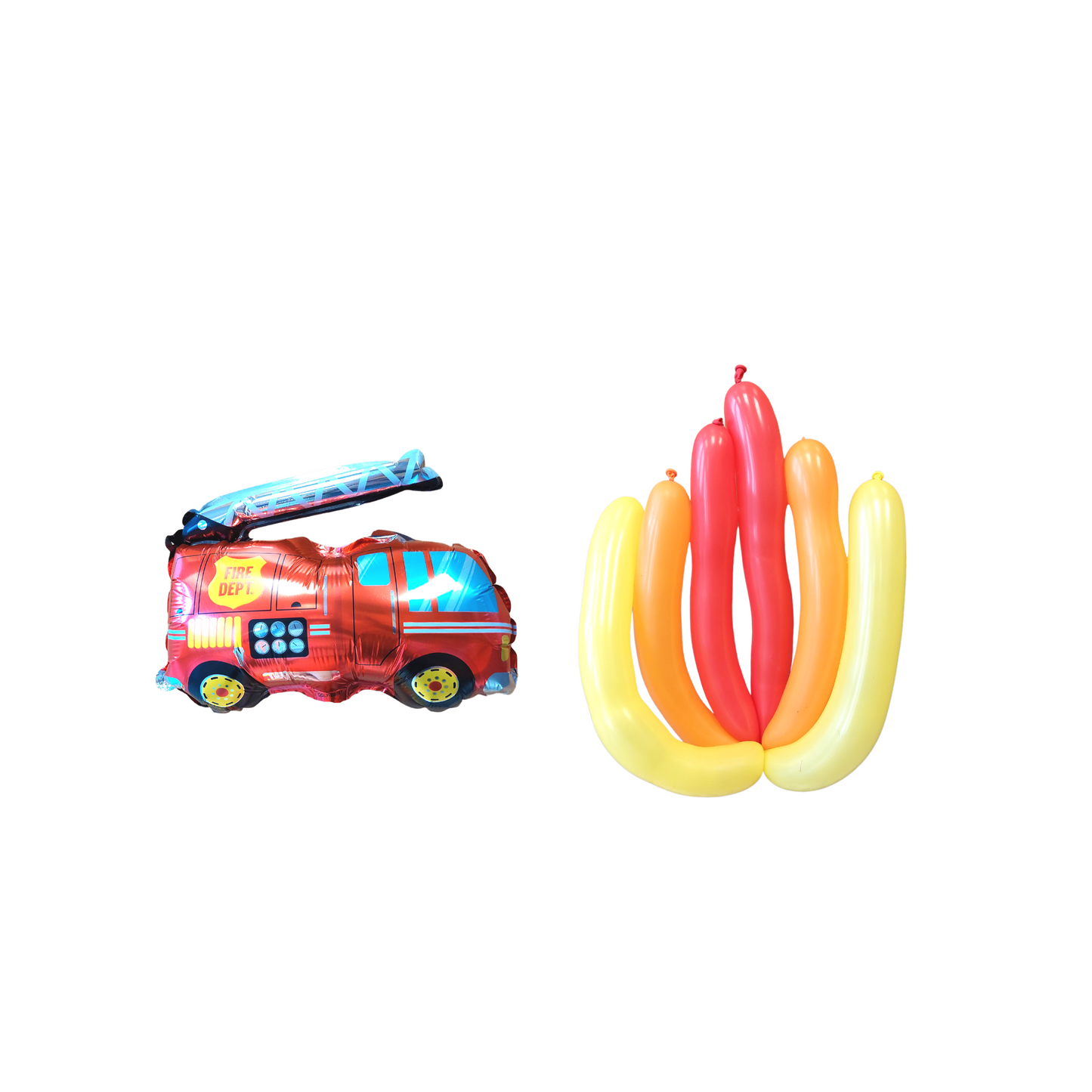 Fire engine pack includes: 12-pack 12" latex balloons in orange, yellow, red and black, 1-pack 40" red number balloon, 4-pack 5" mixed red and yellow balloon, 2-pack small fire engine balloon, 3-pack stick balloon in yellow, orange and red( for making the fire balloon) , balloon glue dots, balloon ribbon.