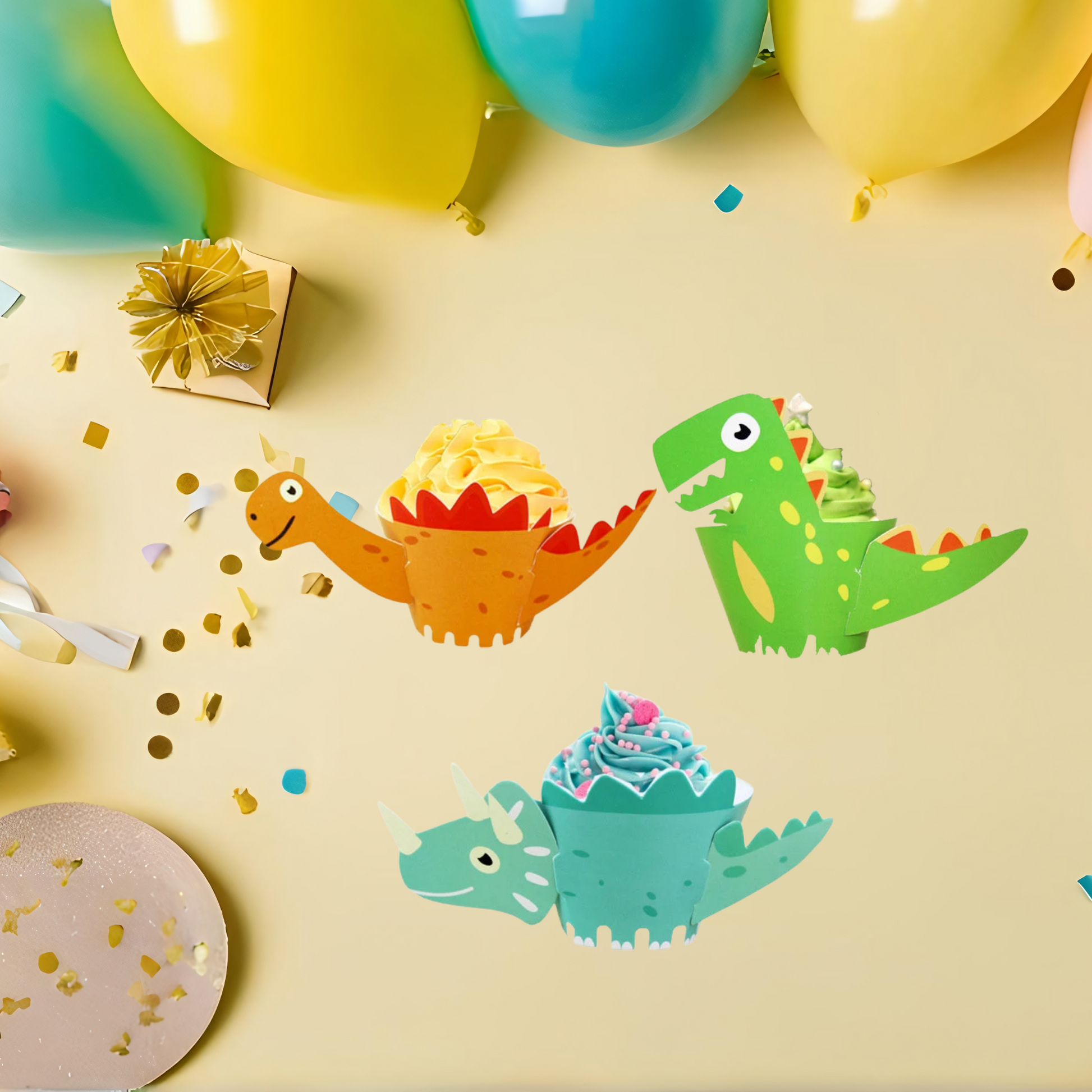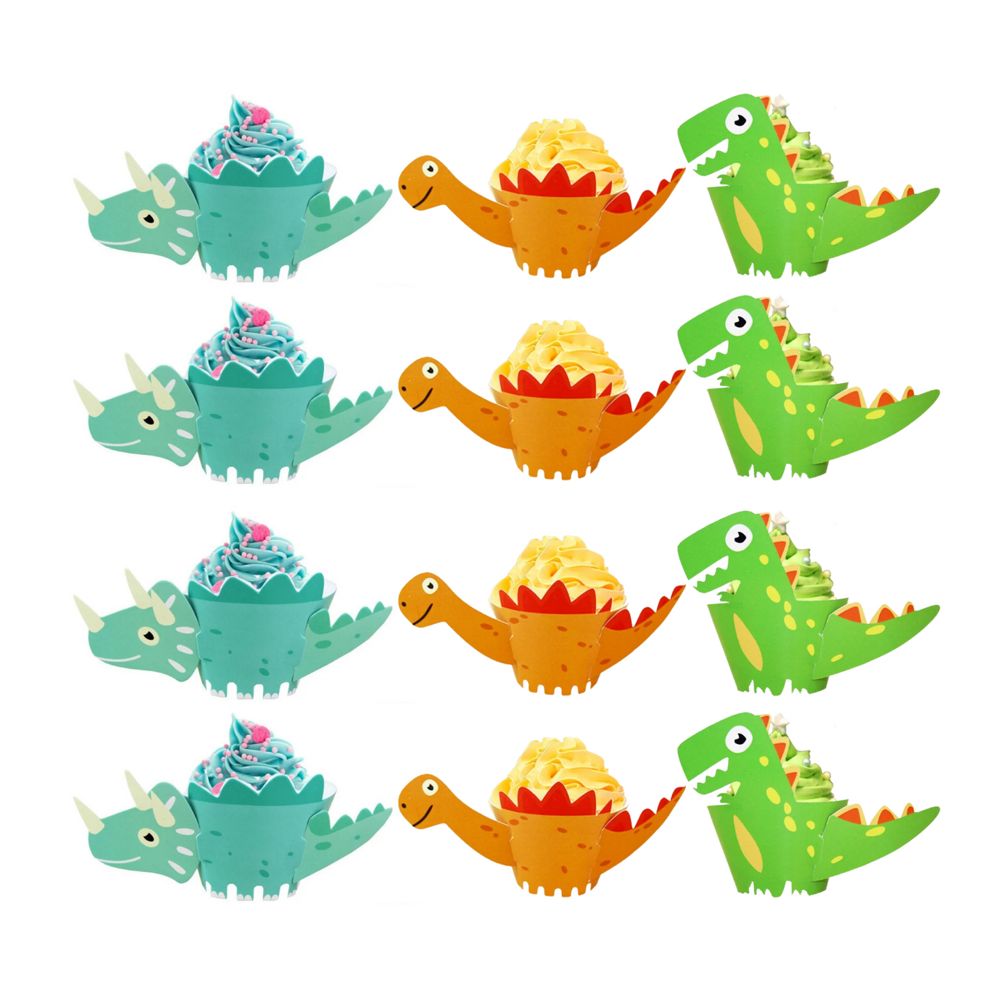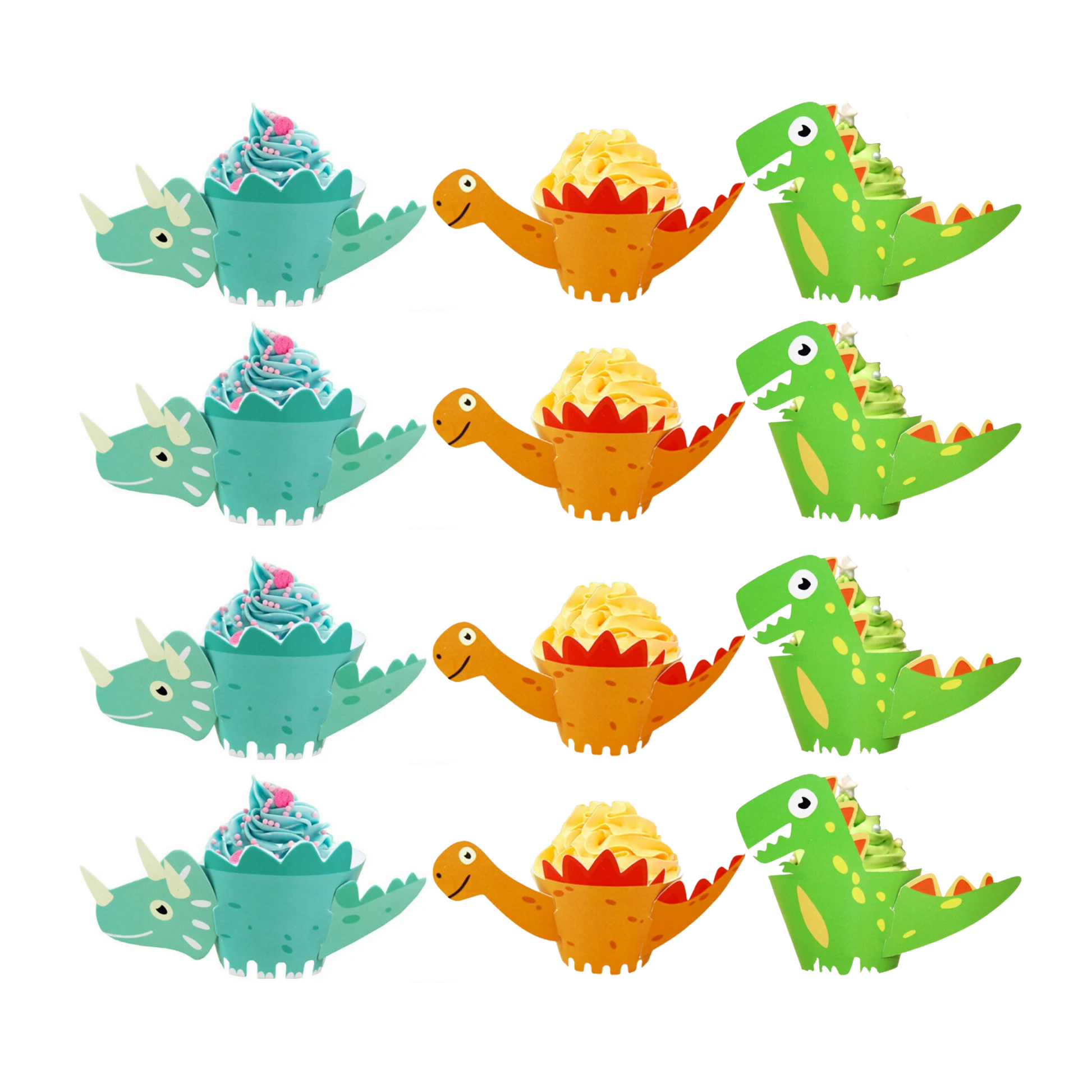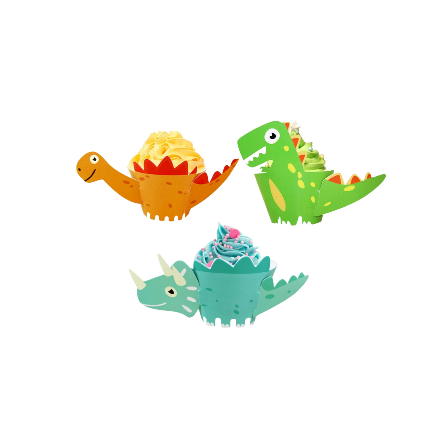 Really cute 3 designs dinosaur cup cake holders, made of paper card, eco friendly and recyclable, each design contains 3-pack, 12 PCs in total for 12 cupcakes. Nice quick solution for your cake decoration.