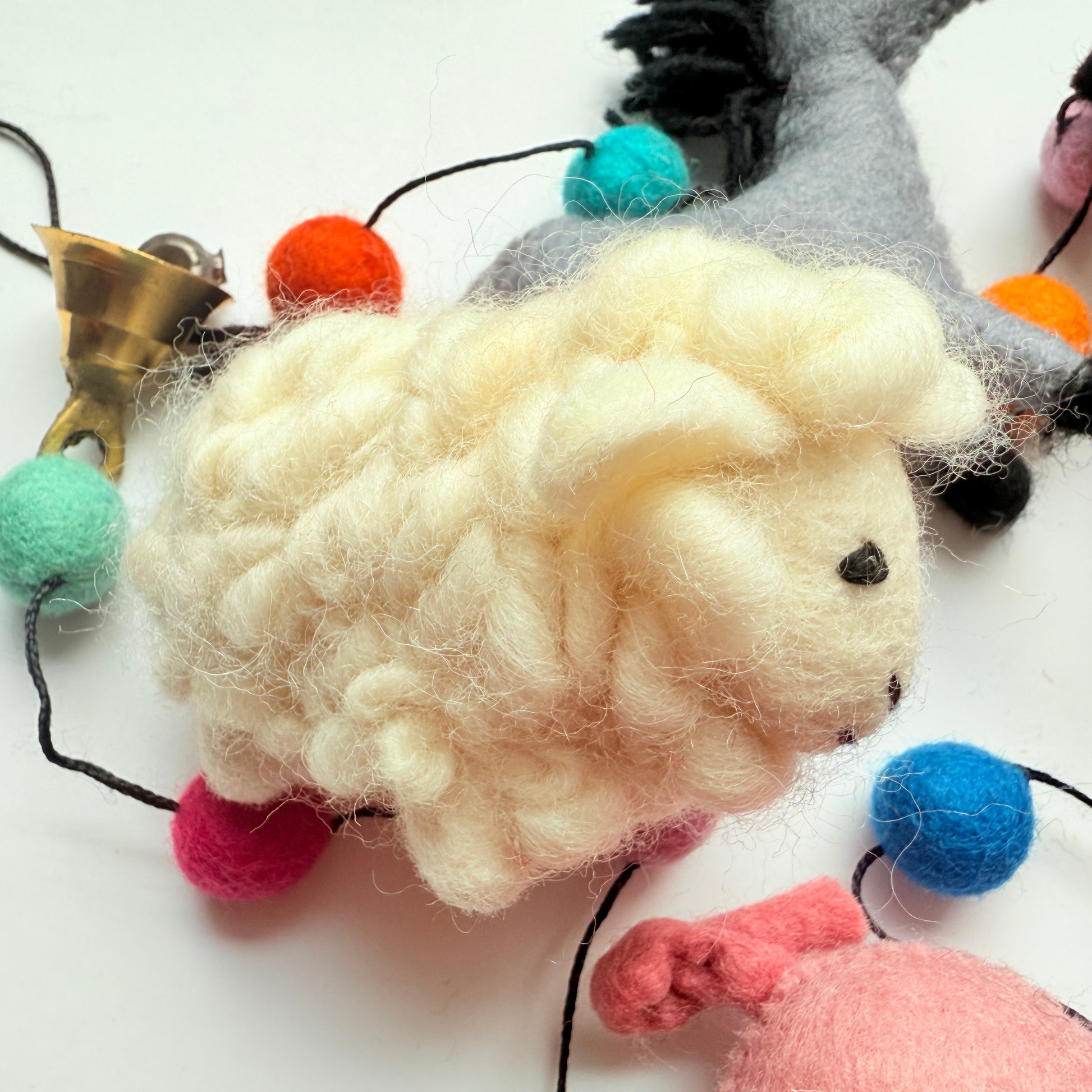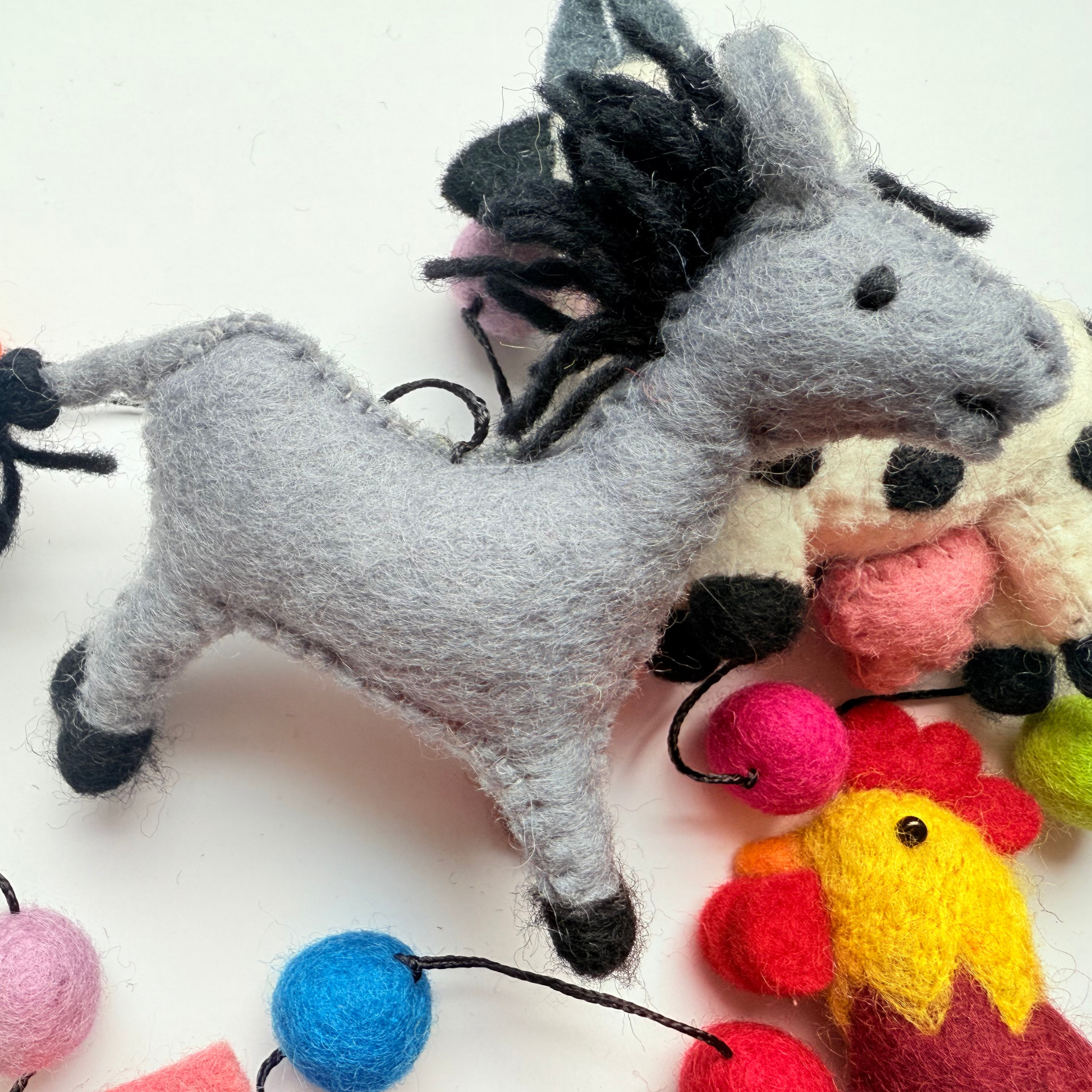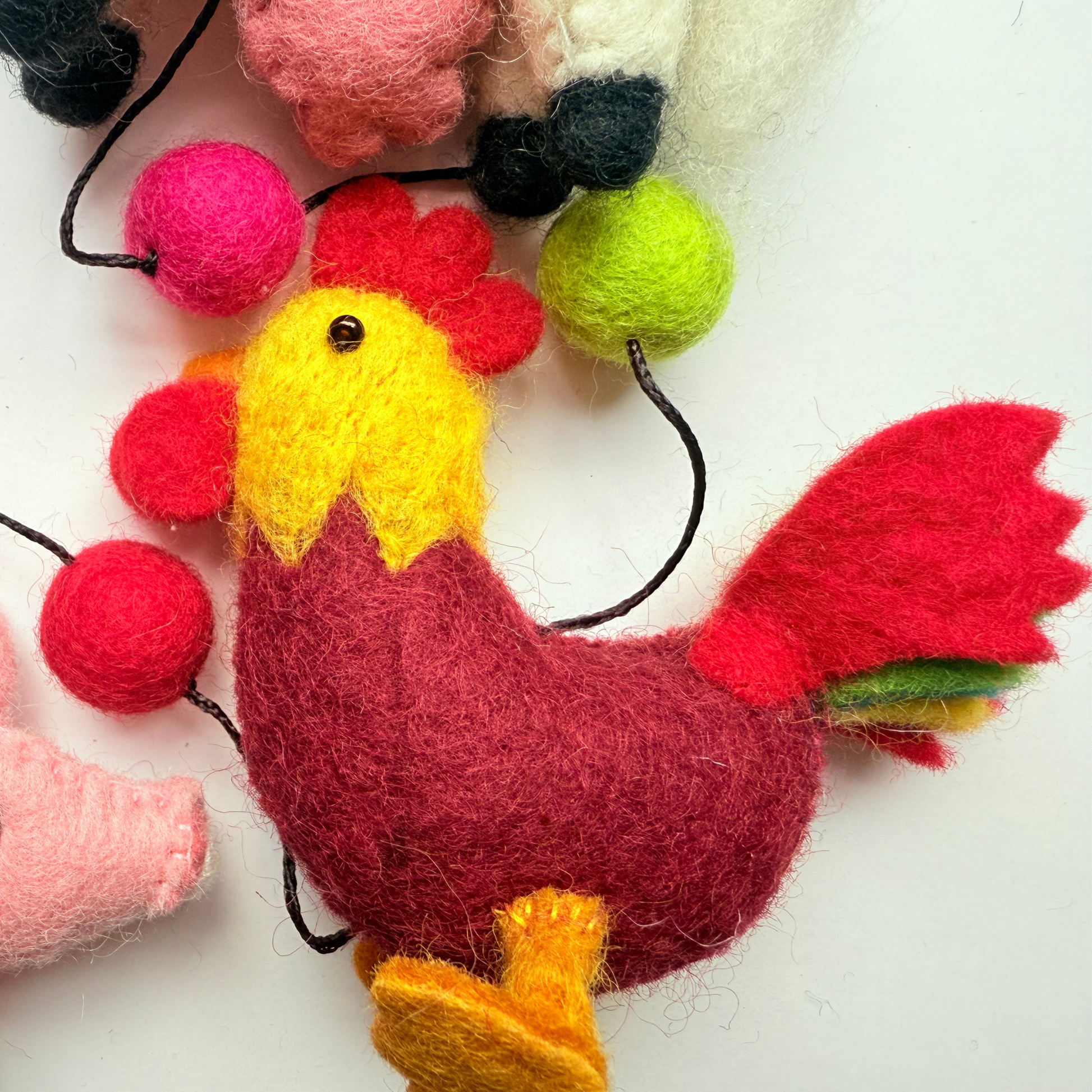5pcs animals, 5pcs pompoms, in a chain ready to hang.