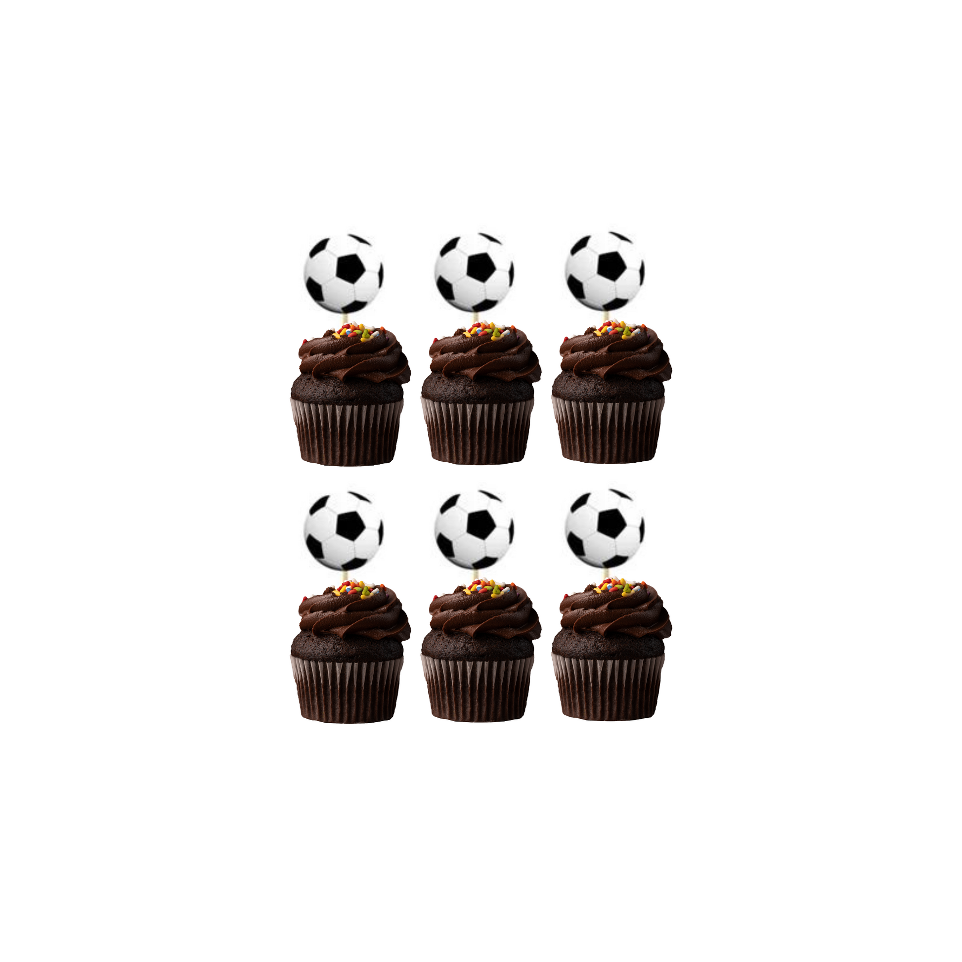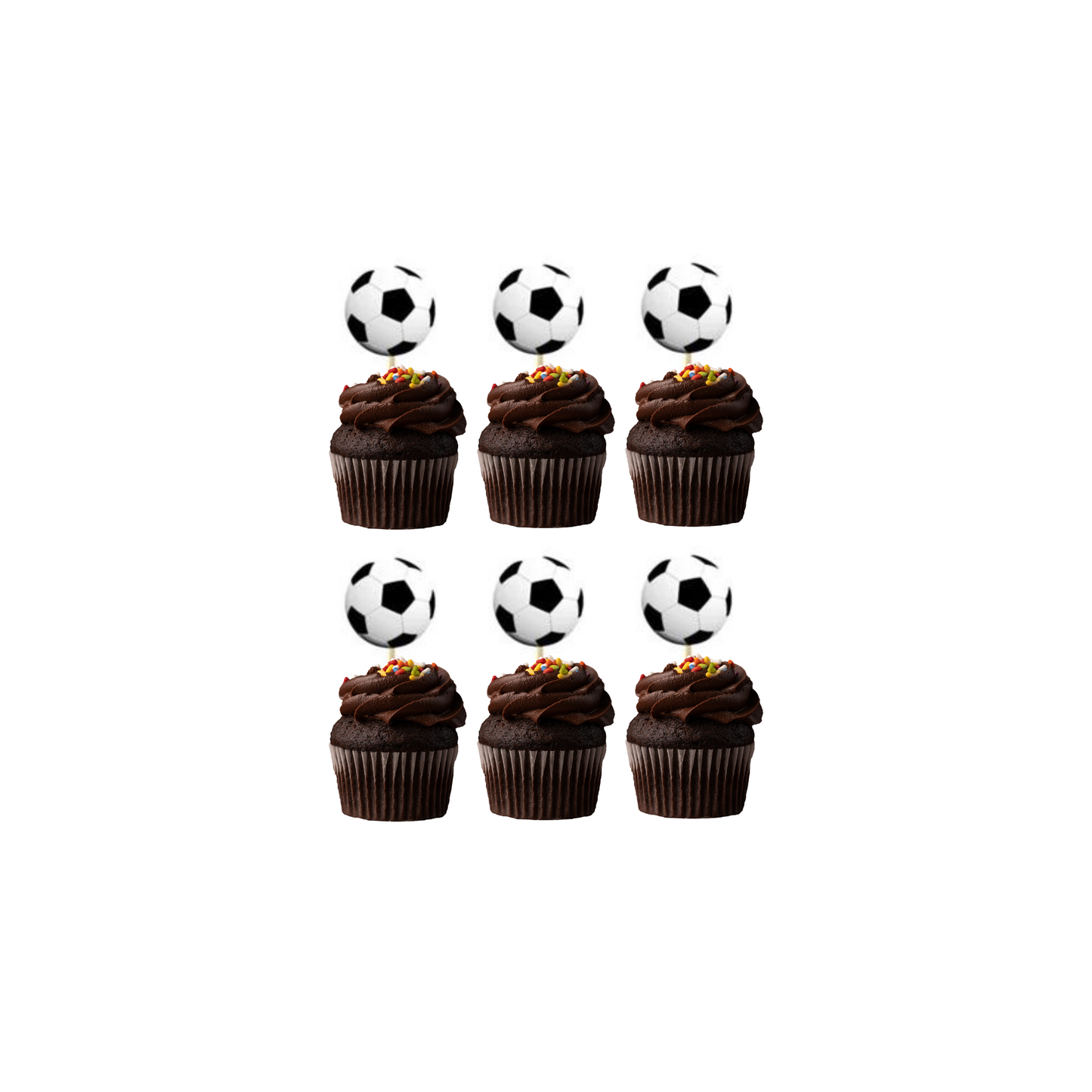 Football print cup cake toppers, 24-pack, 5cm each, made of paper card, 100% recyclable.