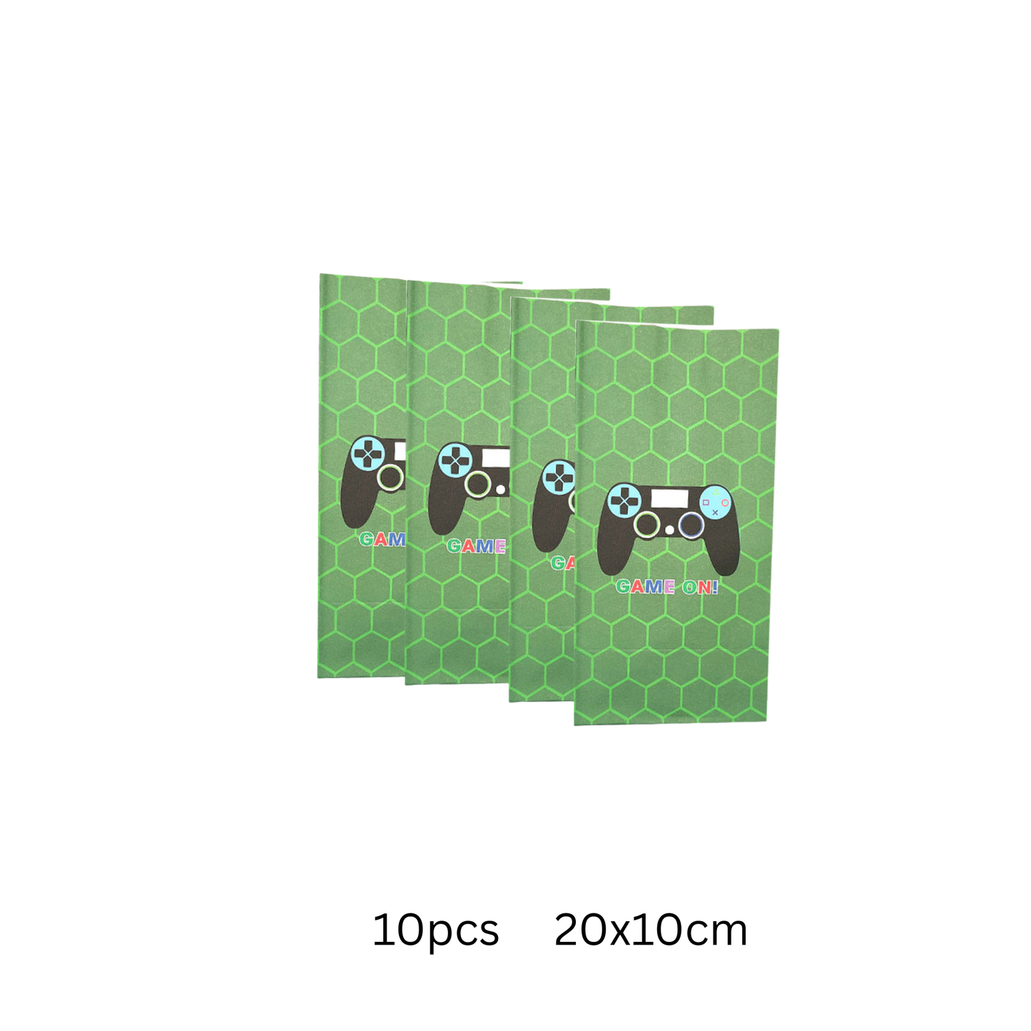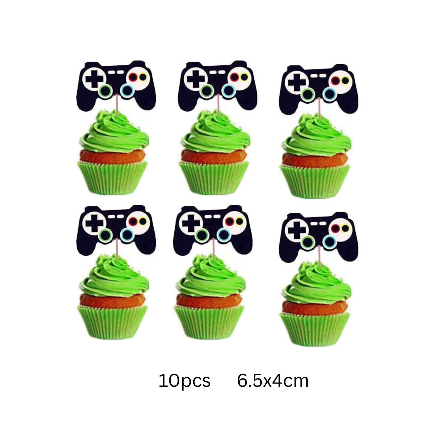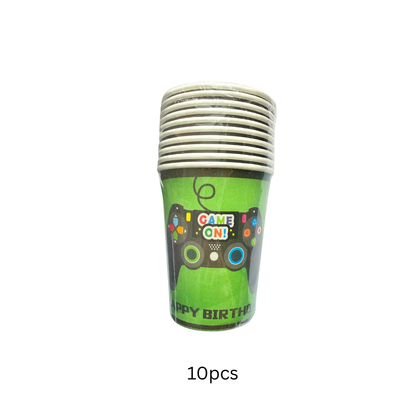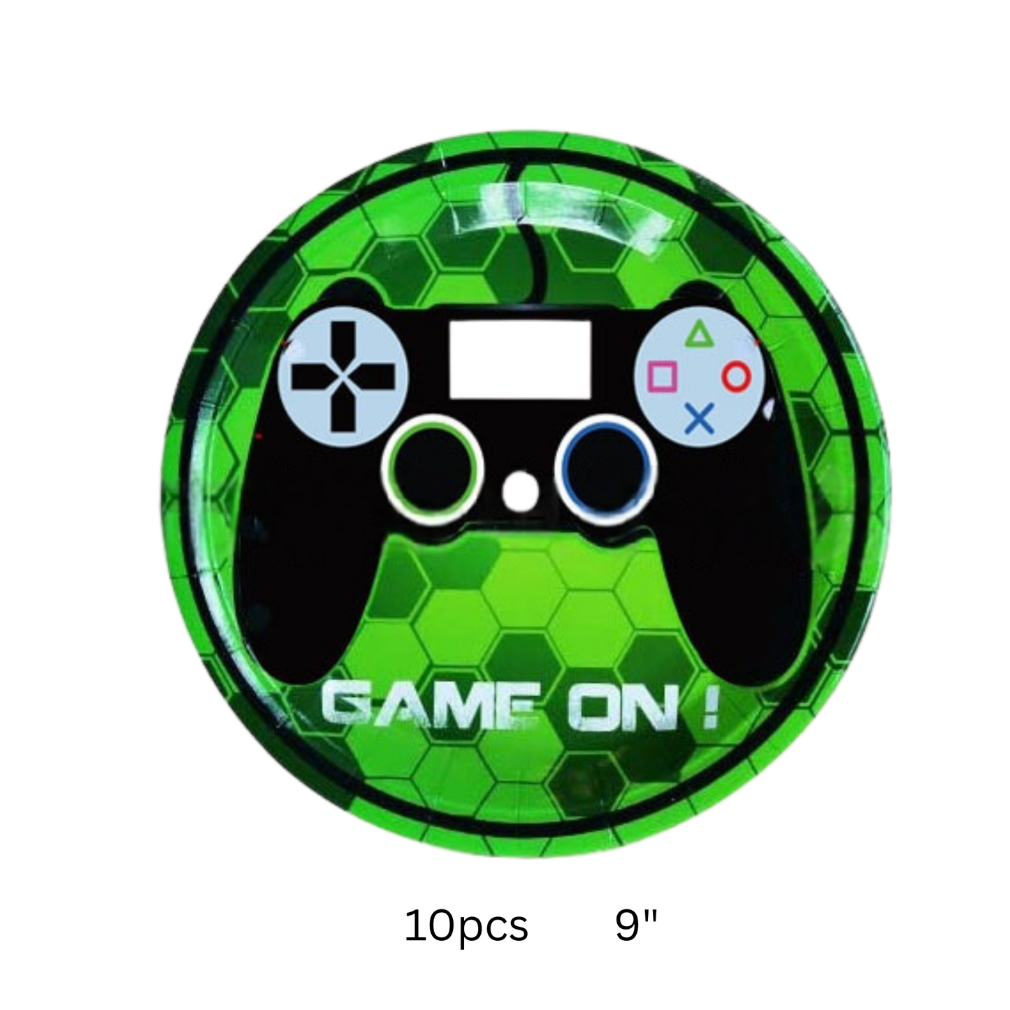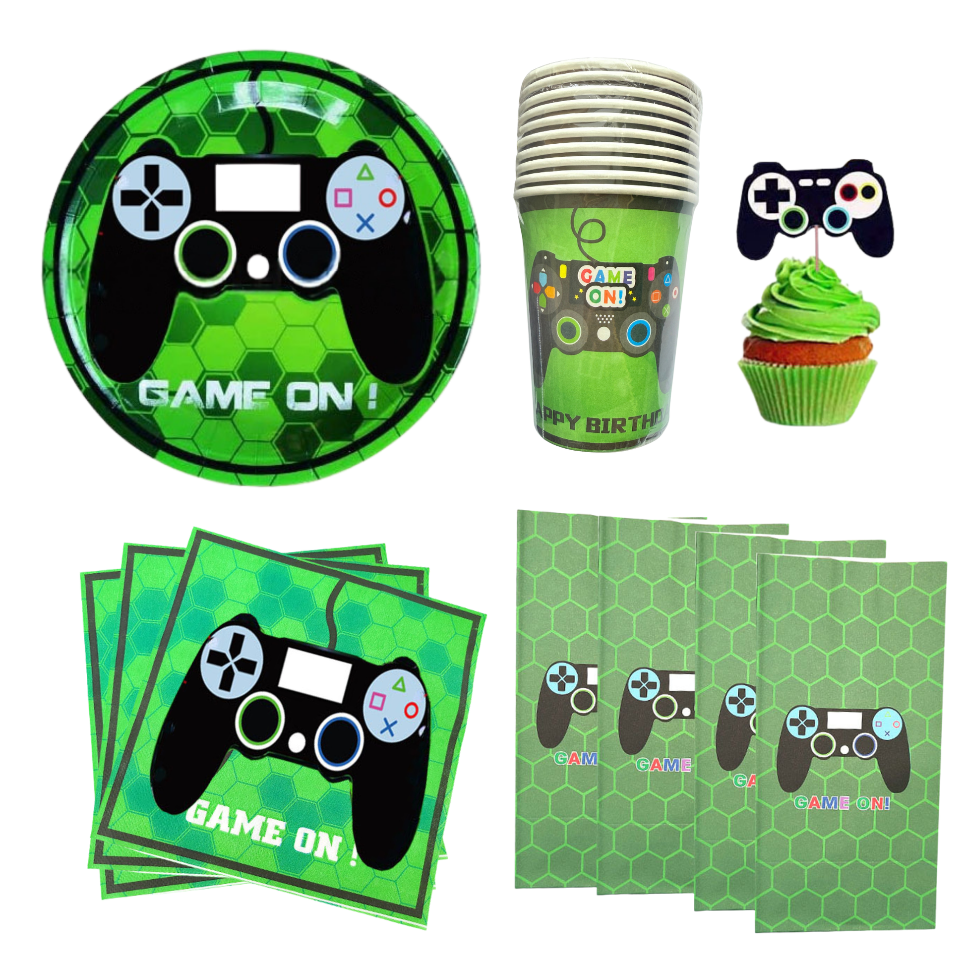 Game control pattern, 10pcs each, 9inch paper plate, cups, party bags, napkins and cup cake toppers.