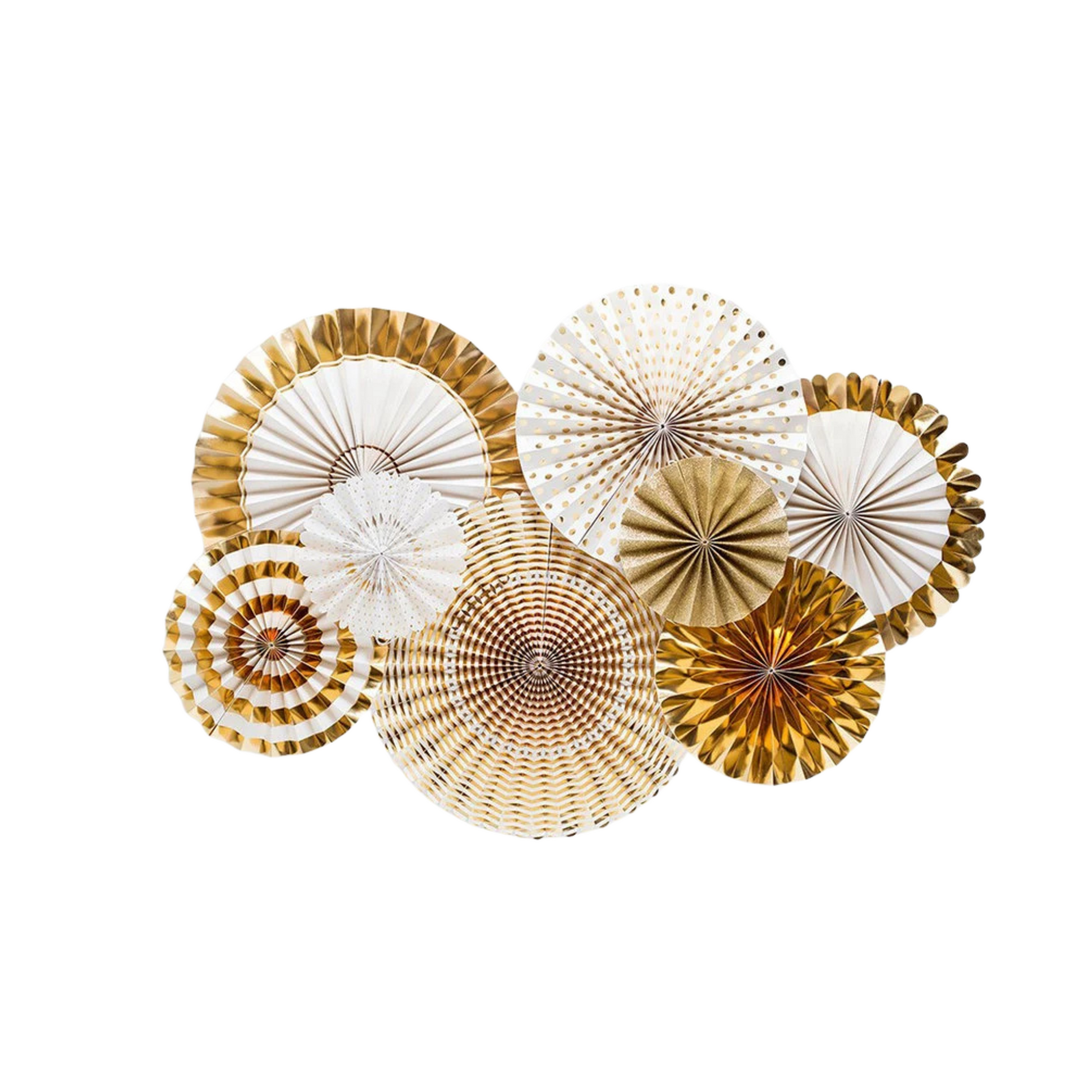 Eco friendly gorgeous 8-packs mixed gold paper fan decoration. Varies ways to style them. They come in a flat pack, requires a bit DIY to put them together.