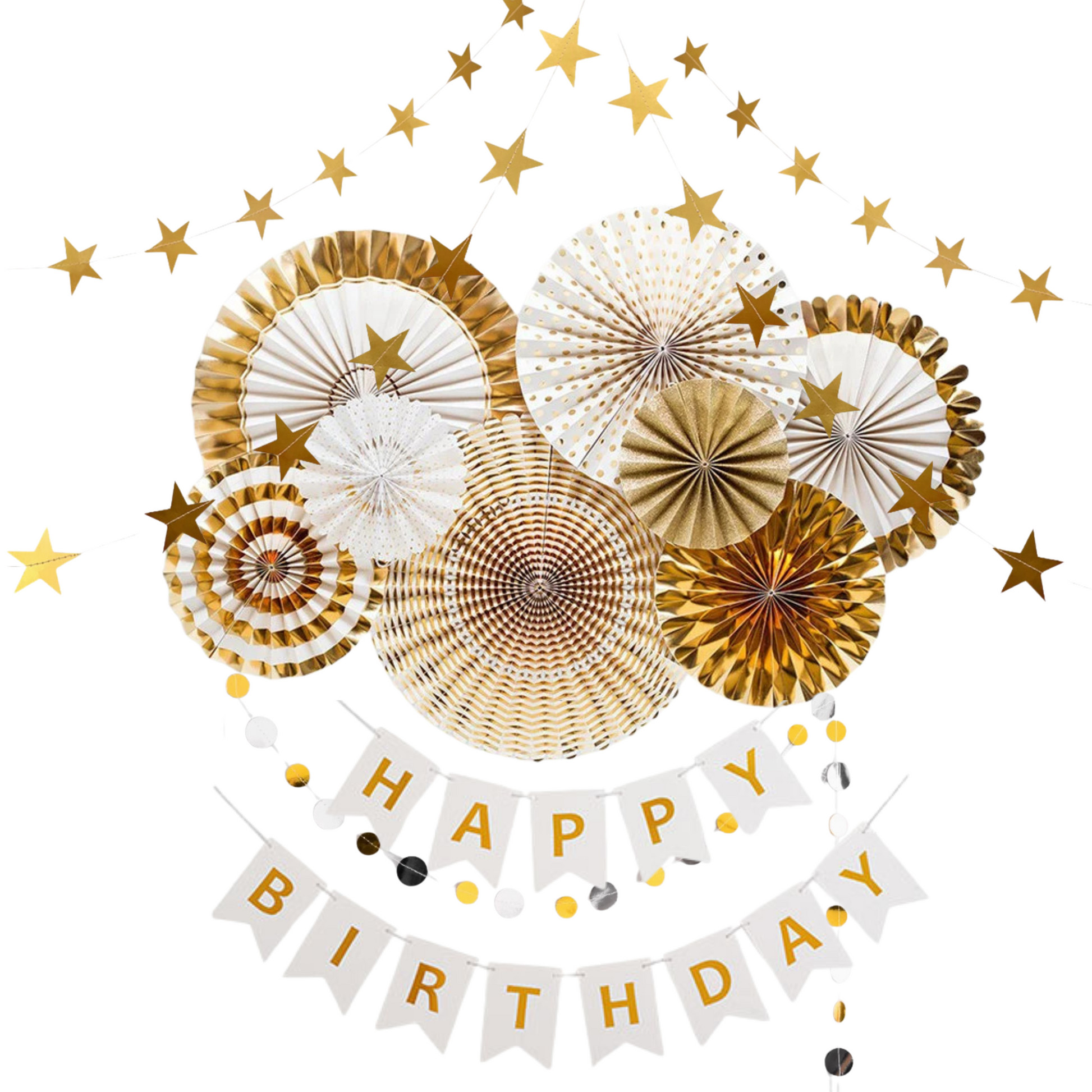 Pack includes: 8-Pack mixed sizes paper fan. 20cm, 25cm, 30cm, 40cm, 2PCs each. 4m star(5cm) bunting, 3m circle(5cm) bunting, white happy birthday paper flags(16cm height) bunting banner.