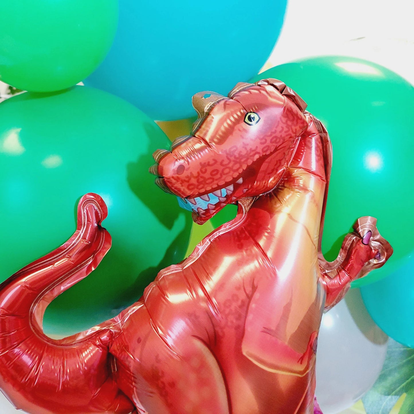 Balloon chain, glue dots, small T rex balloon, 6pcs leaves are included.