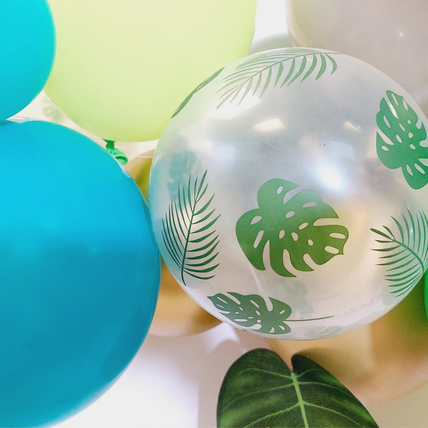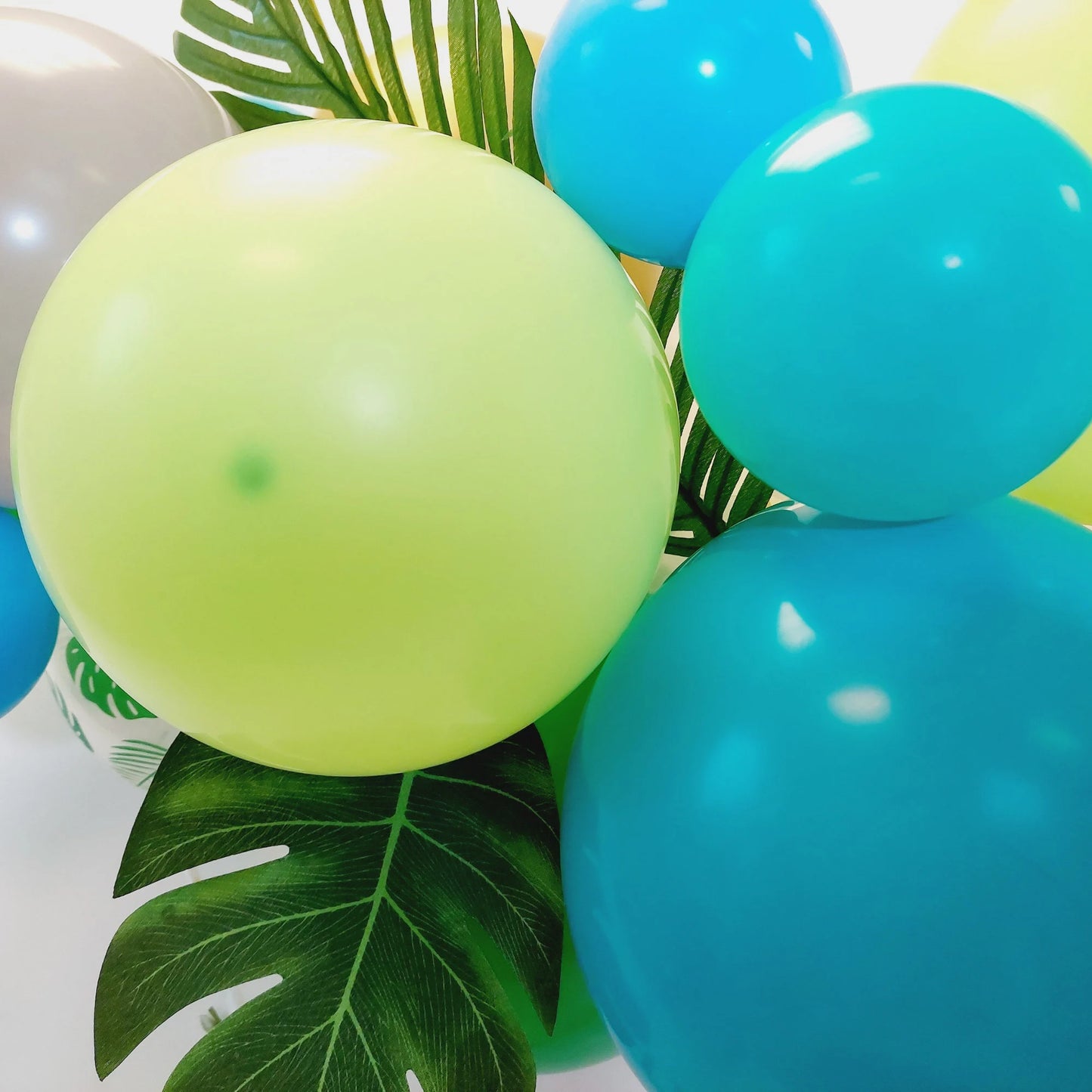 Green and blue dinosaur balloon garland, mixed 5 colours of 12inch balloons, in total 40PCs 12inch balloons and 8PCs 5inch balloons, make a 5-foot length balloon garland. Colours are lime, green, blue, grey, leaves print.