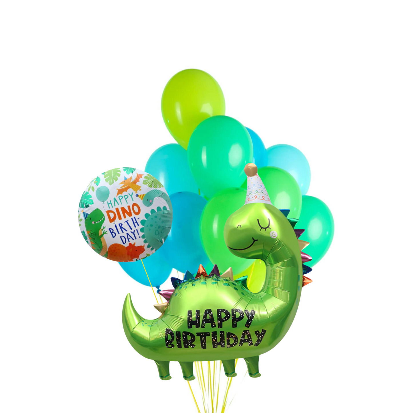 Cute bunch of balloons, include 1-pack 30inch Dino with hat balloon, 1-pack 18inch round balloon with dino print, 10-pack mixed 12inch blue and green latex balloon, straw and ribbon.