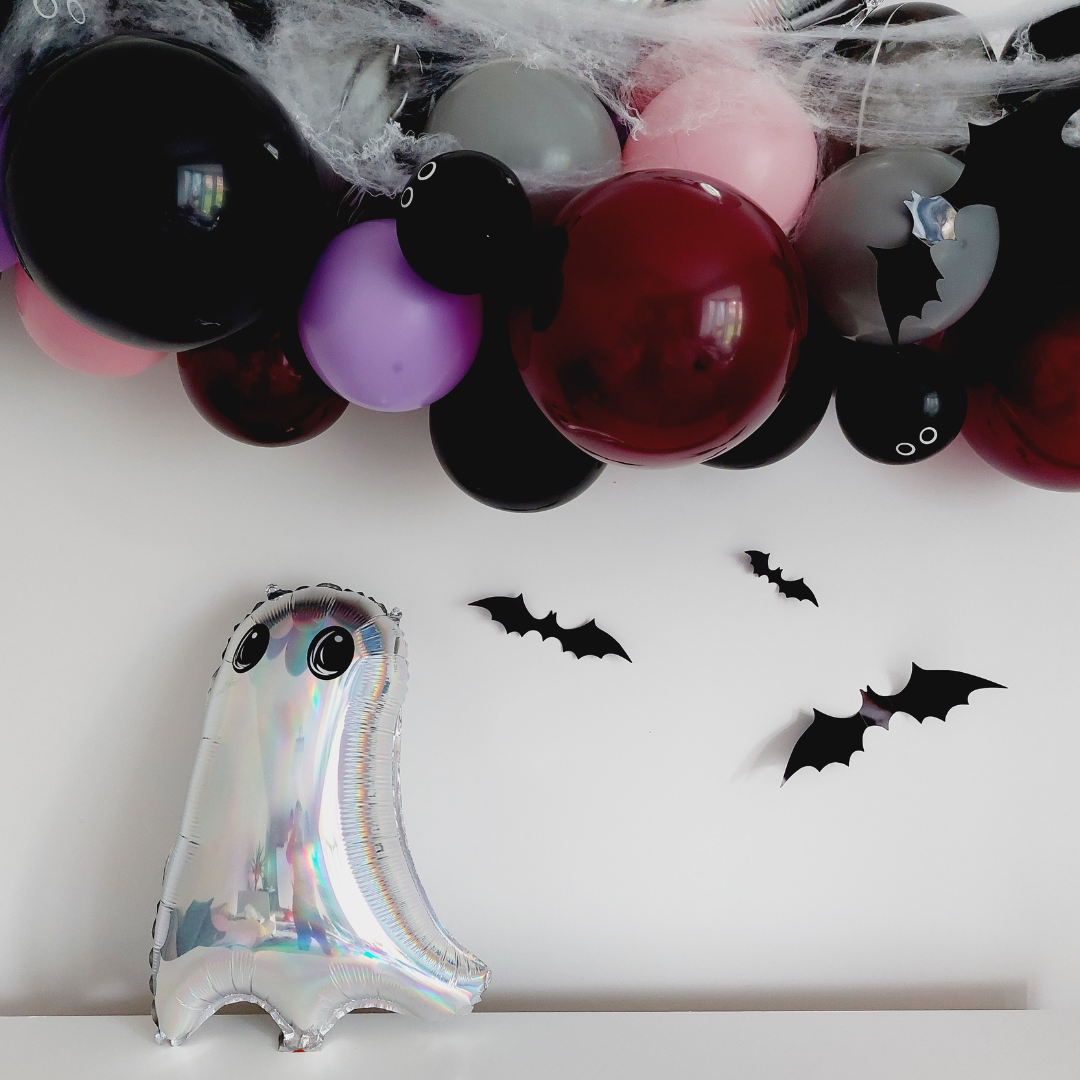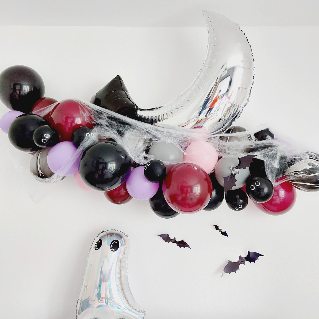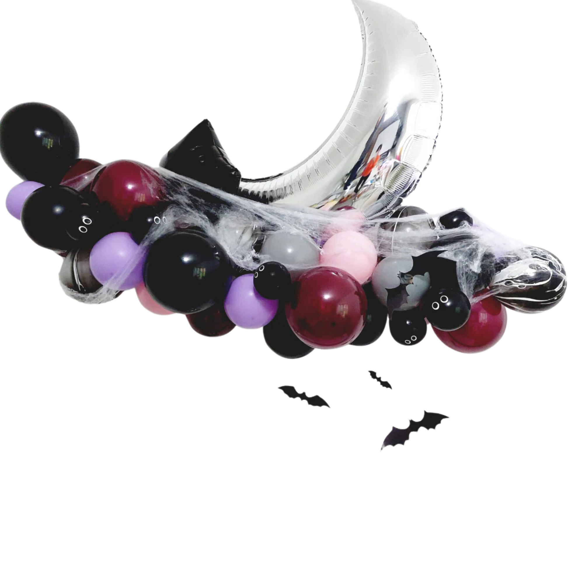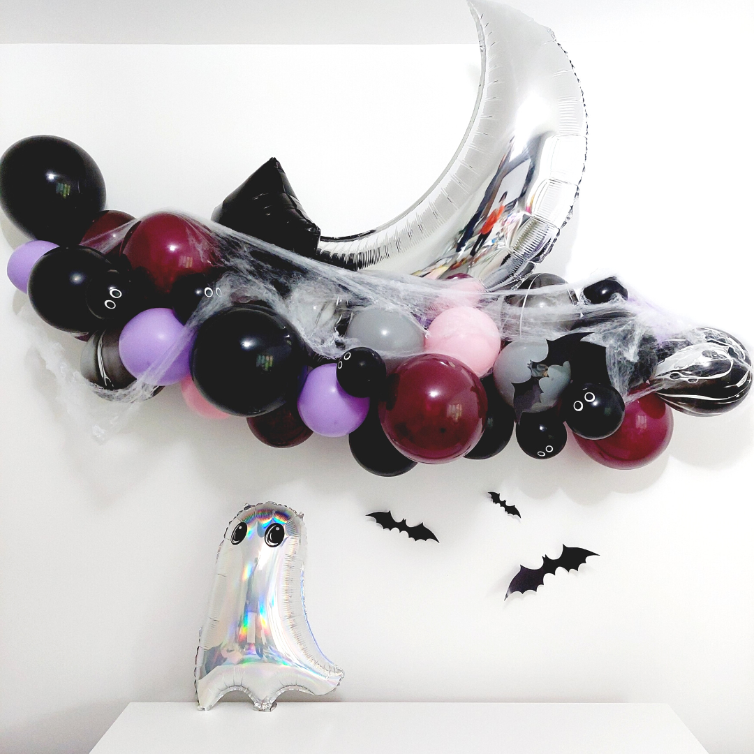Specially designed black, burgundy and purple balloon garland(cloud) for Halloween party, such a special design highlight with 5inch little black monster balloons and 12inch black marble balloons, even more with cotton spider webs, bats, 36inch silver moon balloon, 18inch black star balloon and a 18inch monster balloon, everything in a kit! This garland can be hung down the ceiling as a cloud or just as a wall decoration, instruction is included.