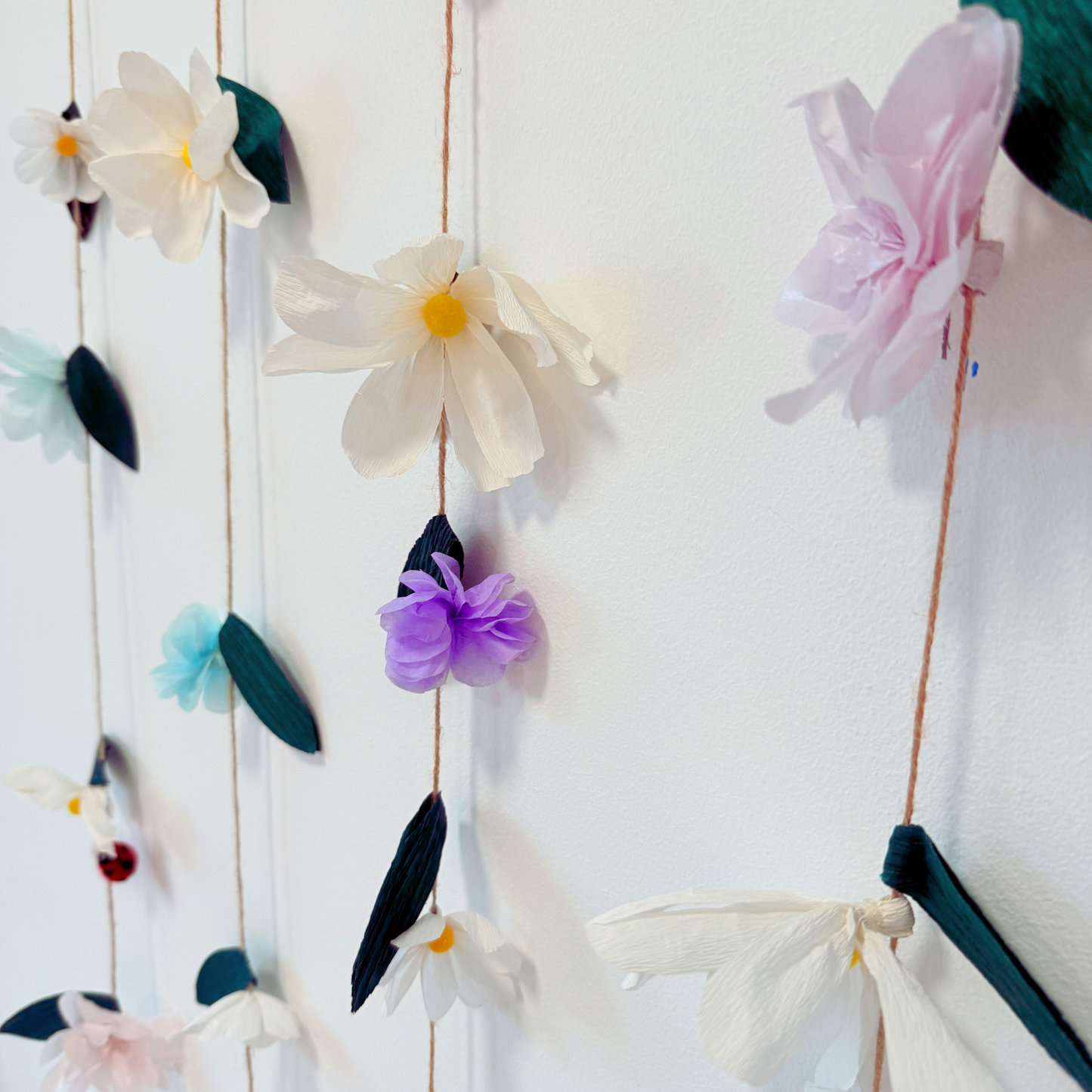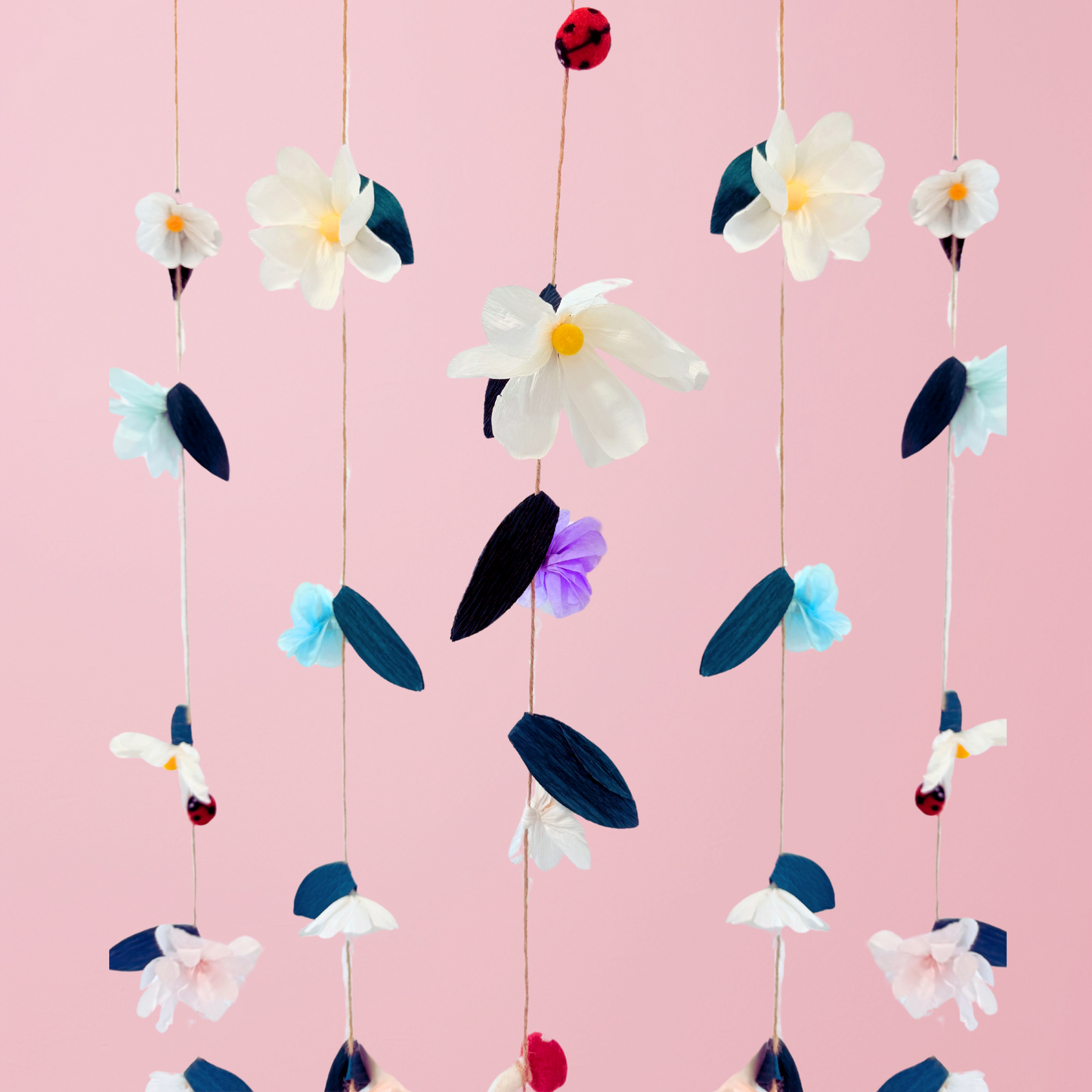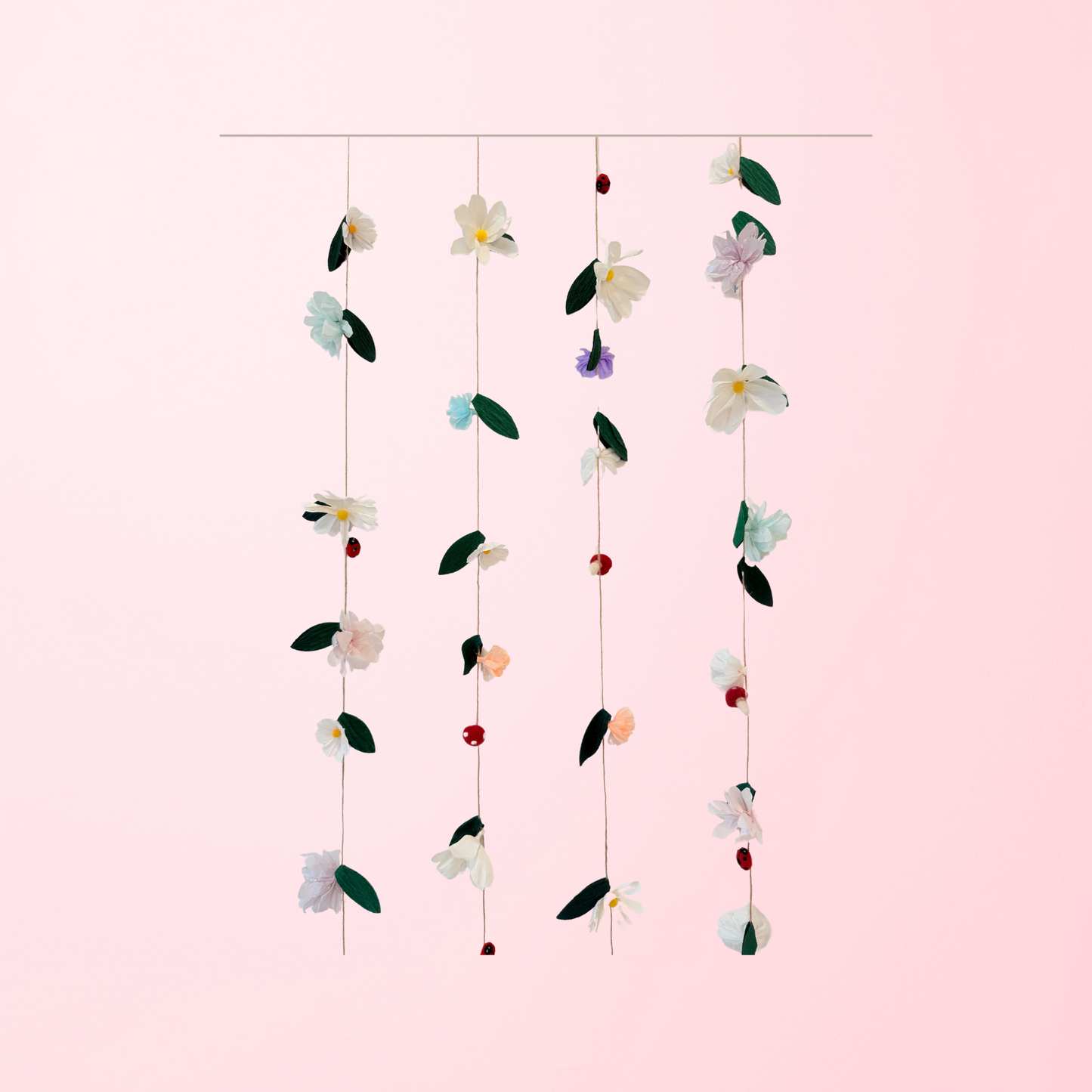 This beautiful fairy wander land style hanging decoration is 100% hand craft, it comes with 4 strings(each 1.8meter)with lots of paper flowers, leaves and felt ladybirds and mushrooms. Unique decoration for rooms or parties.