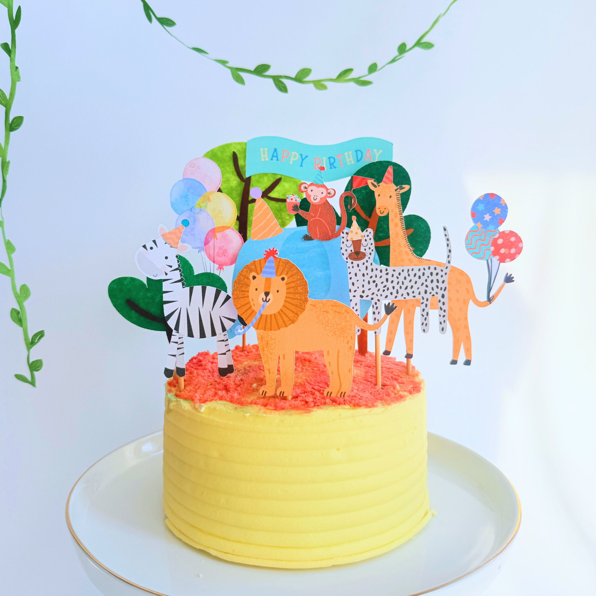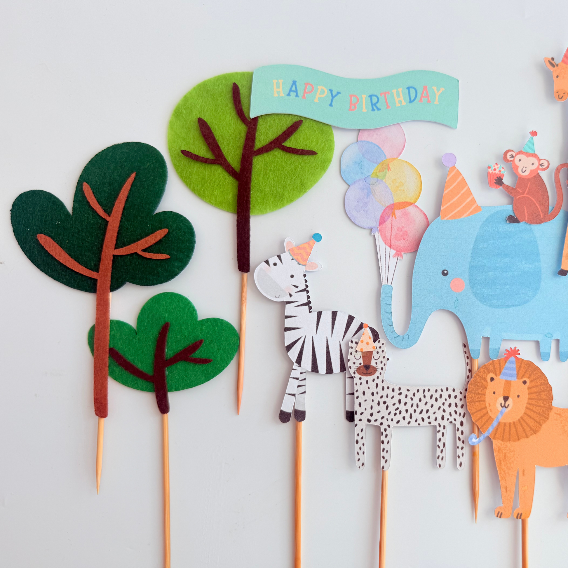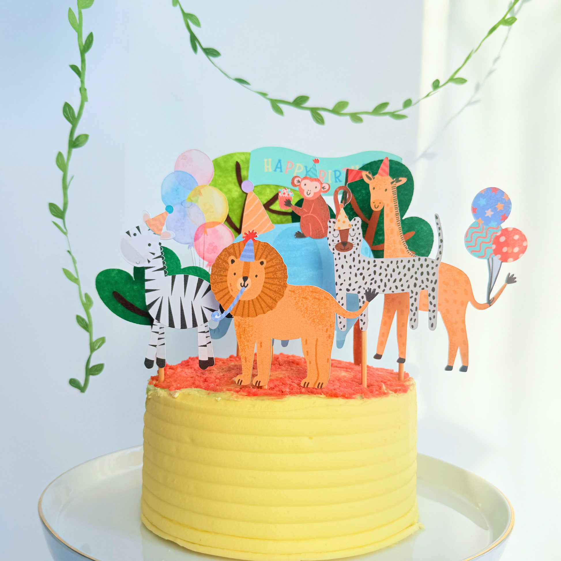 Bring a burst of fun to your child's birthday party with our Animal Parade Cake Topper Set! Featuring a cheerful lion, zebra, giraffe, cheetah, elephant, and a playful monkey with colorful balloons and trees, these vibrant toppers are perfect for a jungle or safari-themed celebration. Made with high-quality cardstock and felt, each topper is beautifully illustrated and ready to make your cake extra special. Easy to use and lightweight, they create an unforgettable centerpiece for birthdays, baby showers, and animal-themed parties. Perfect for young explorers who love animals and adventure!