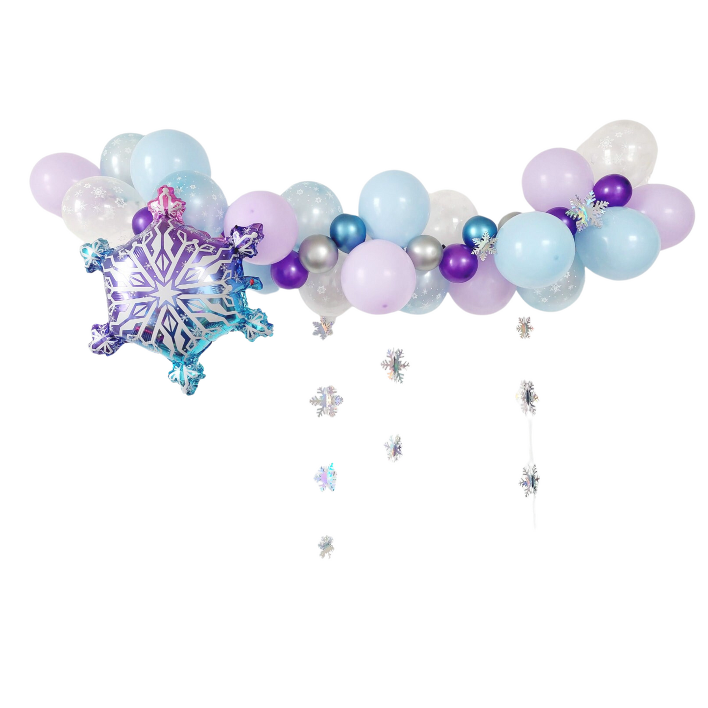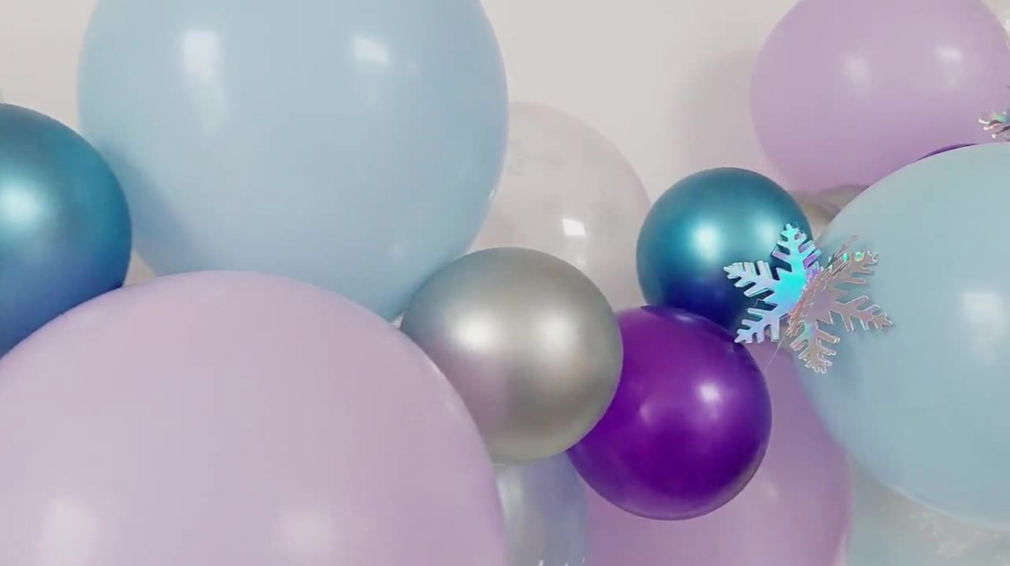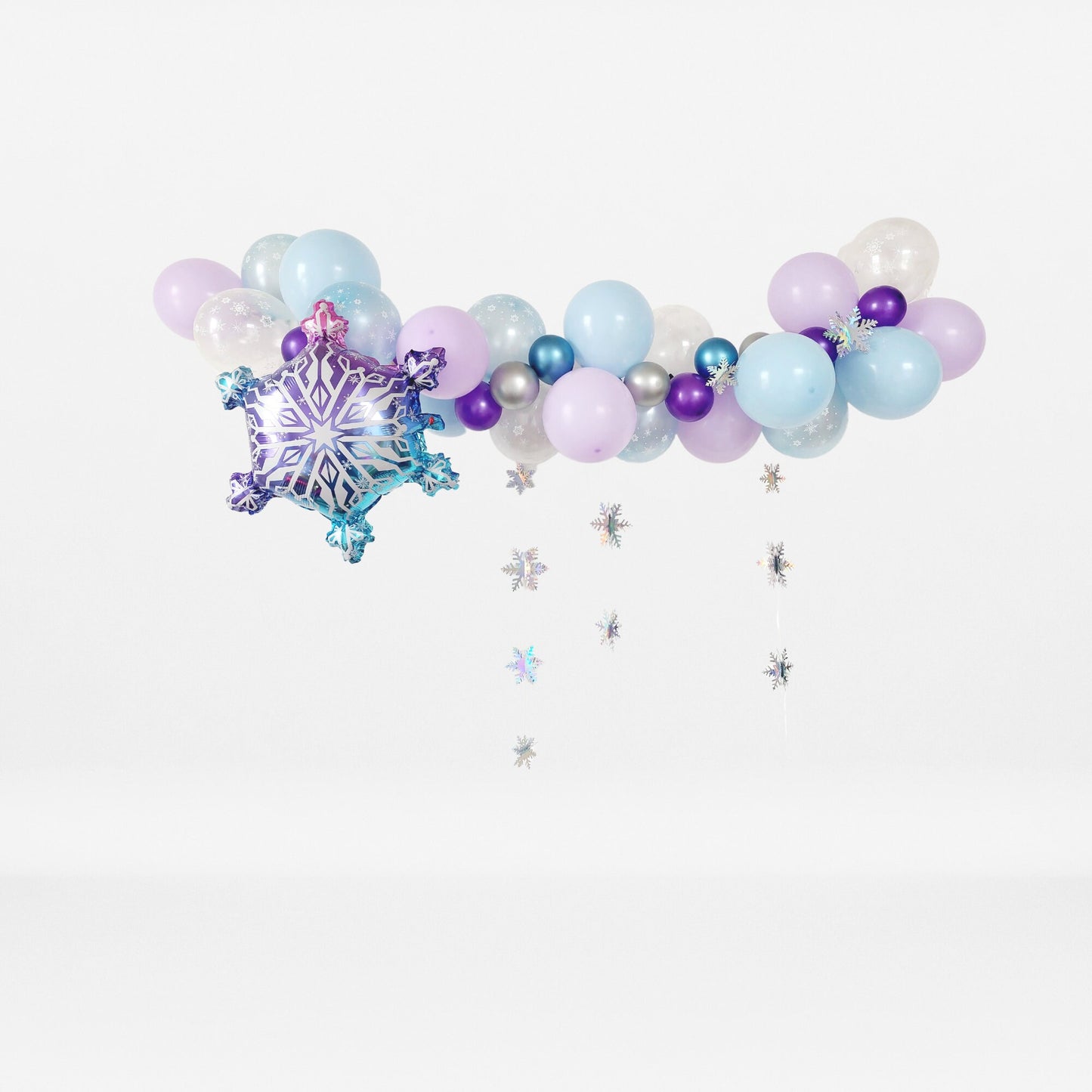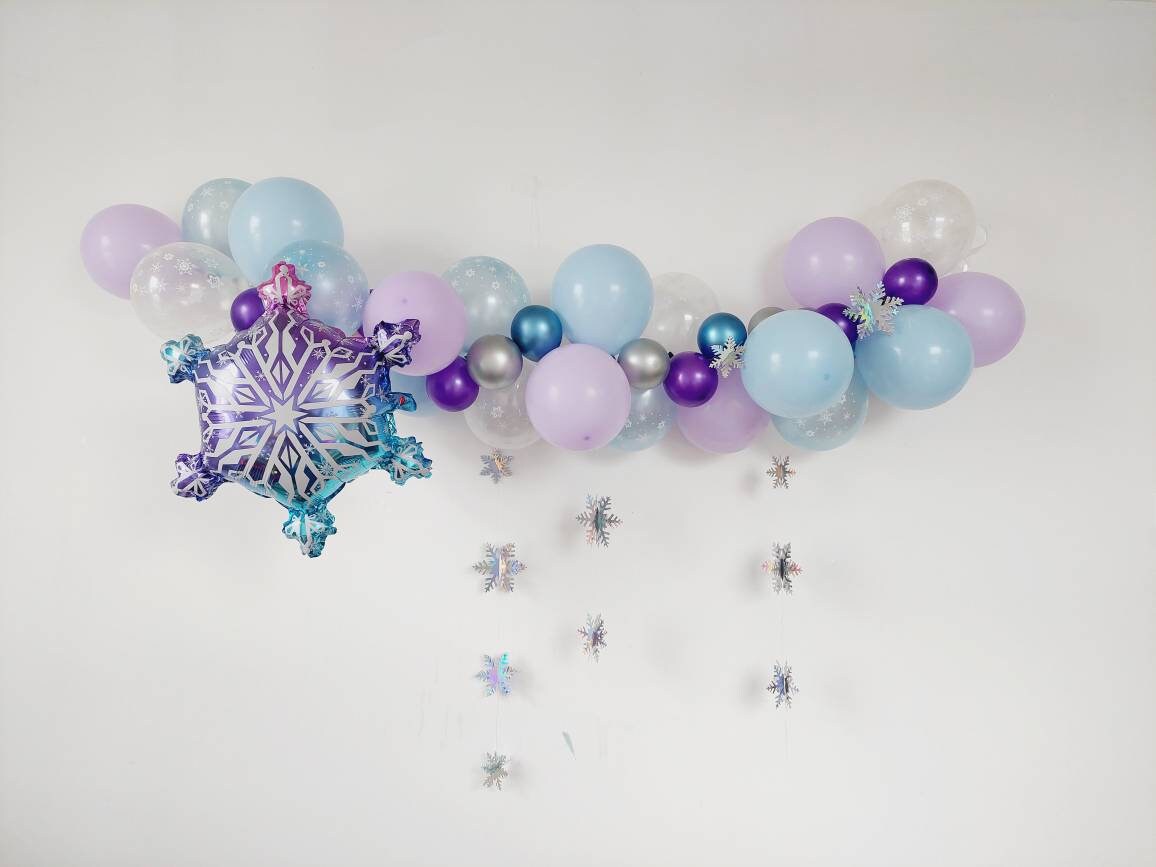 Beautiful 12inch pastel coloured balloons highlight with 5inch blue, purple and silver balloons, decorated with iridescent 3D snow flakes bunting and blue purple 20inch snow flakes balloon, not complicated but just right.