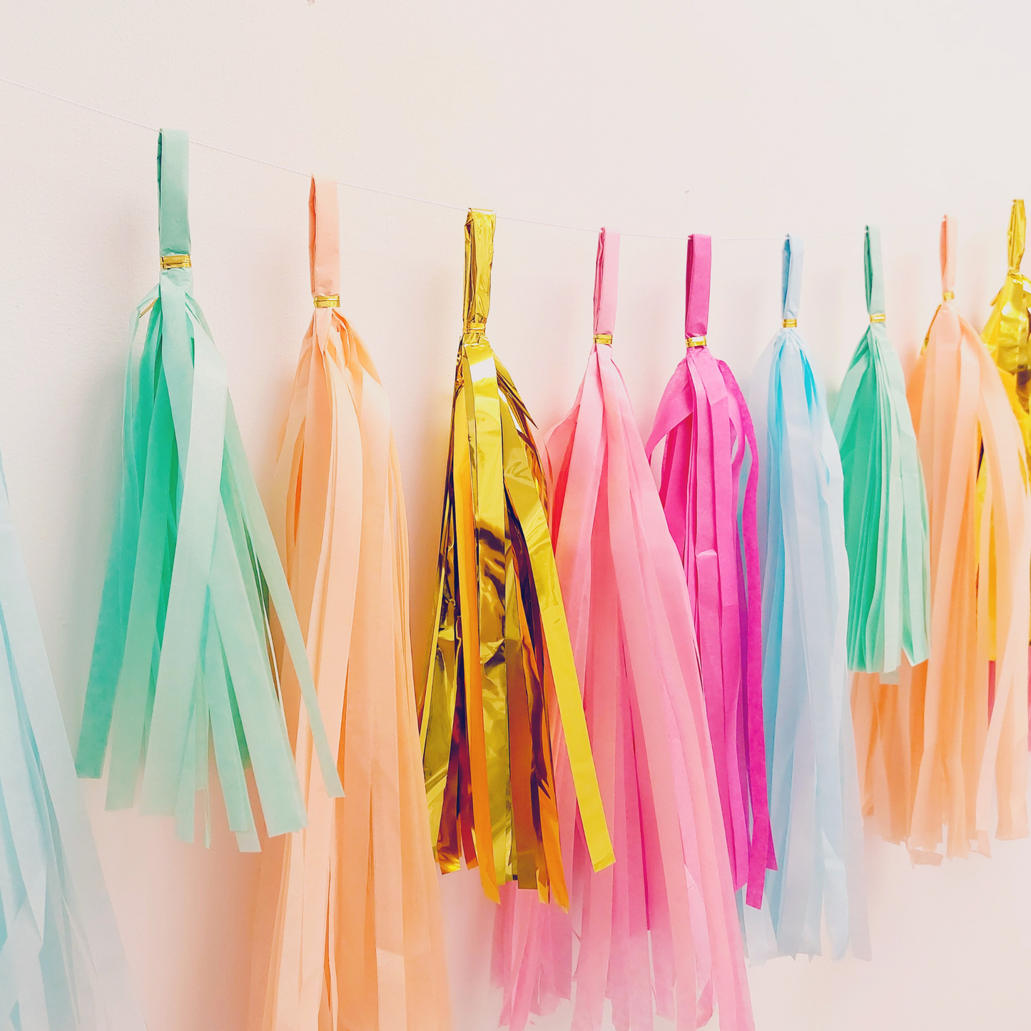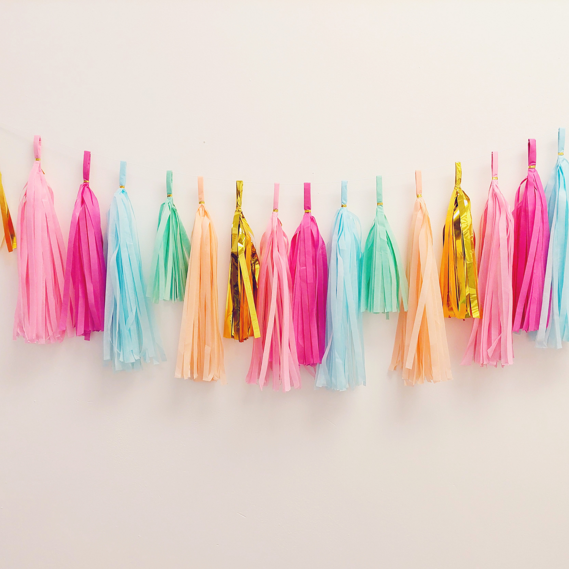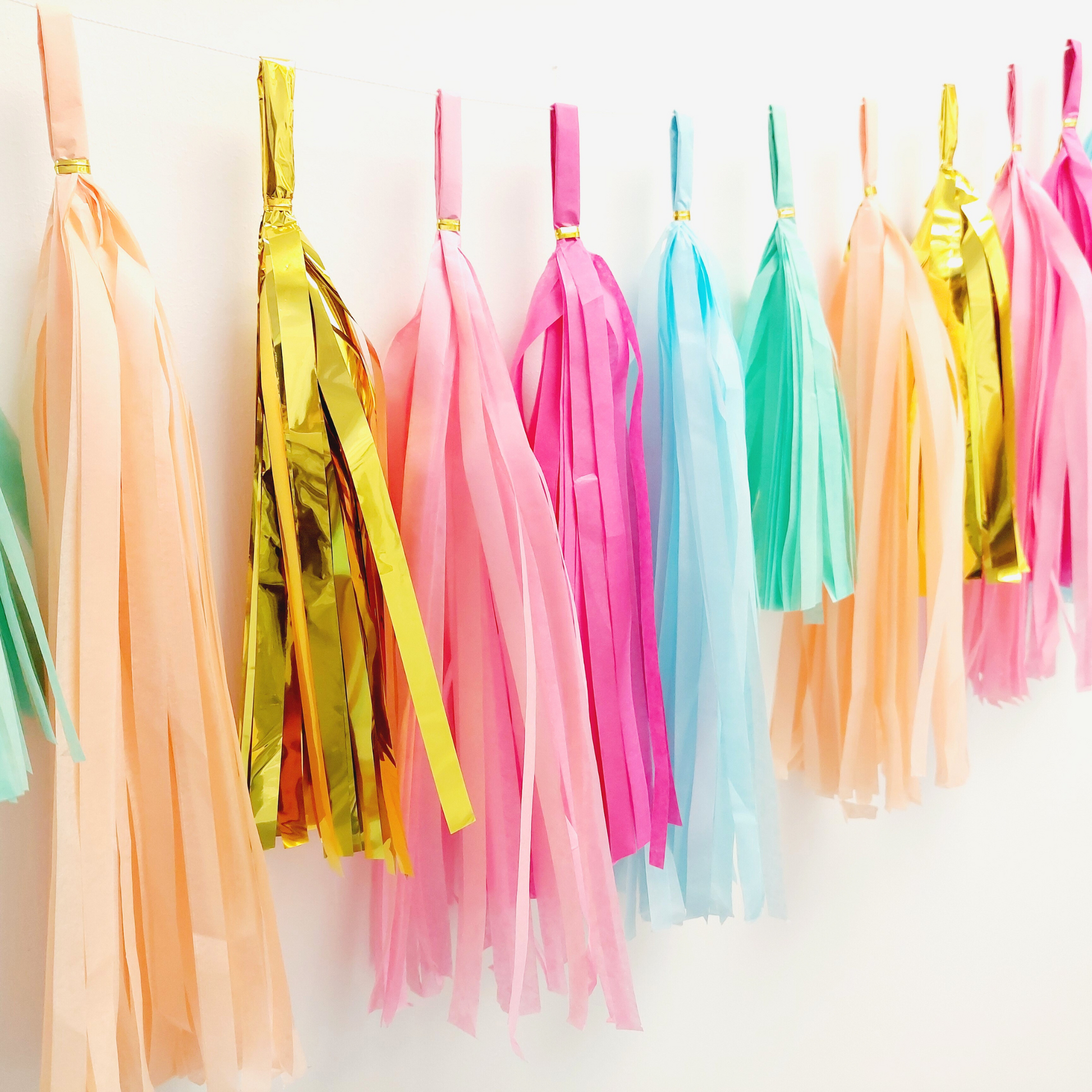 Paper Tassel Garland blue hot pink peach gold tropical summer style