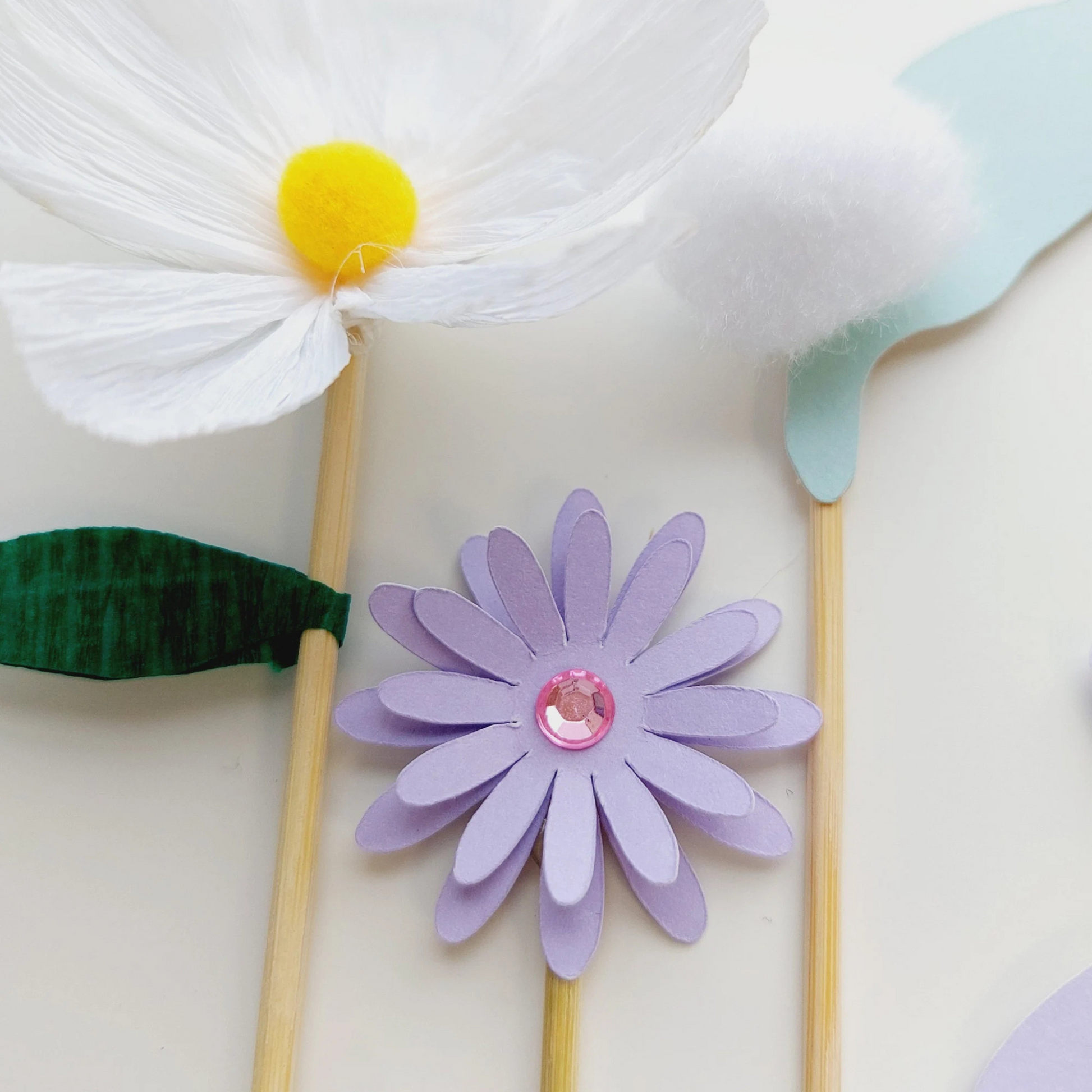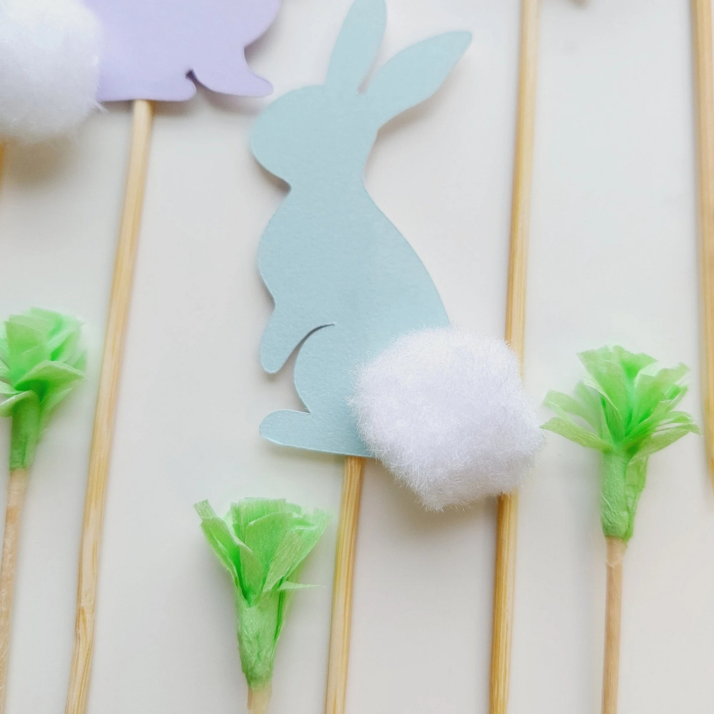 Flowers are made of 250gsm cards and crepe paper, decorated with little artificial gems, bunny rabbits are made of 250gsm cards with pompom balls. They are on bamboo sticks, eco friendly and safe to use.
