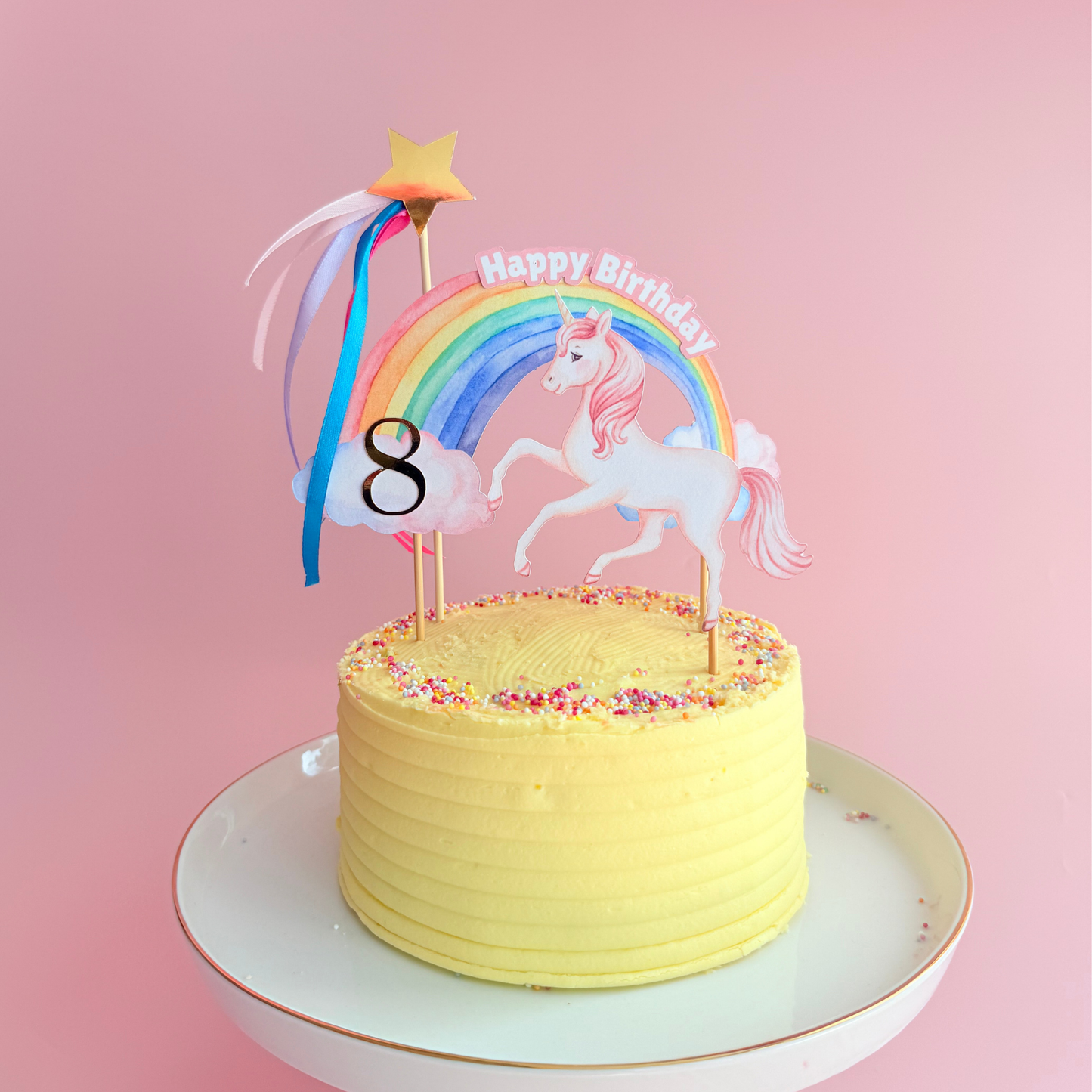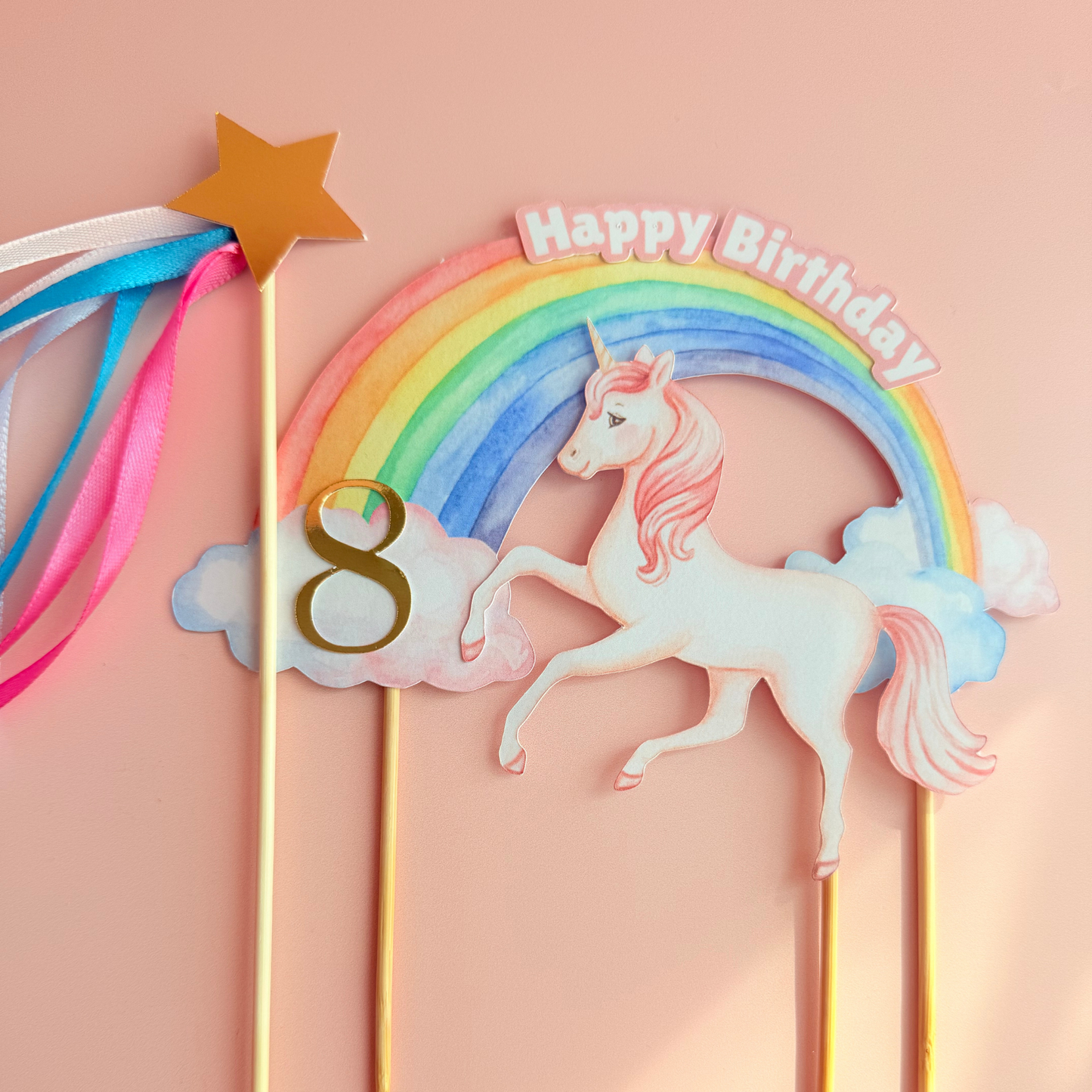 Handmade specially designed rainbow unicorn cake decor, beautifully printed on 300gsm cards, this cake topper is completely personalised with name and birthday age, it featured with a large rainbow(15cm wide), a pink unicorn(12cm wide) and a shooting star with rainbow ribbon stripes.