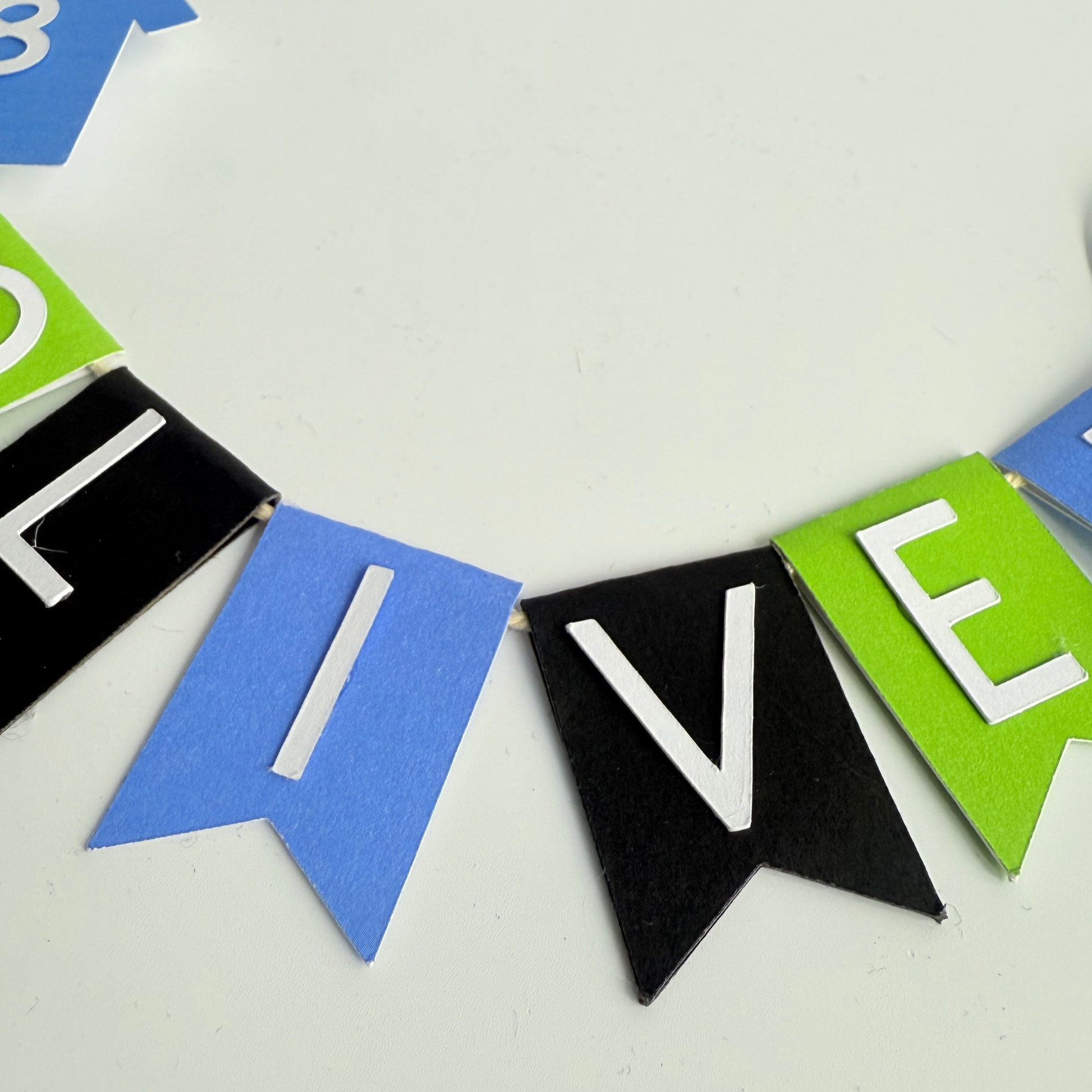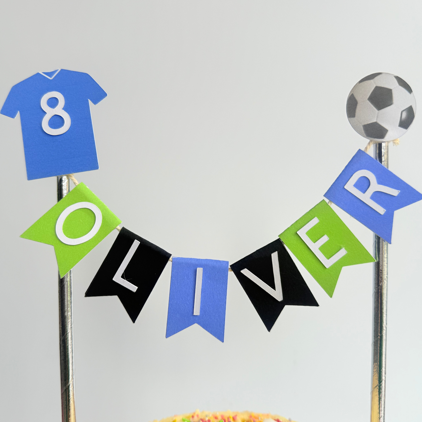 Handmade specially designed football cake decor, this cake topper is completely personalised with name and birthday age, it featured with a mixed blue and green flags banner(each flag 3cm tall) with white card cutout name letters(2.5cm tall), and football t shirt+football on top of each side, sit on silver paper straws.