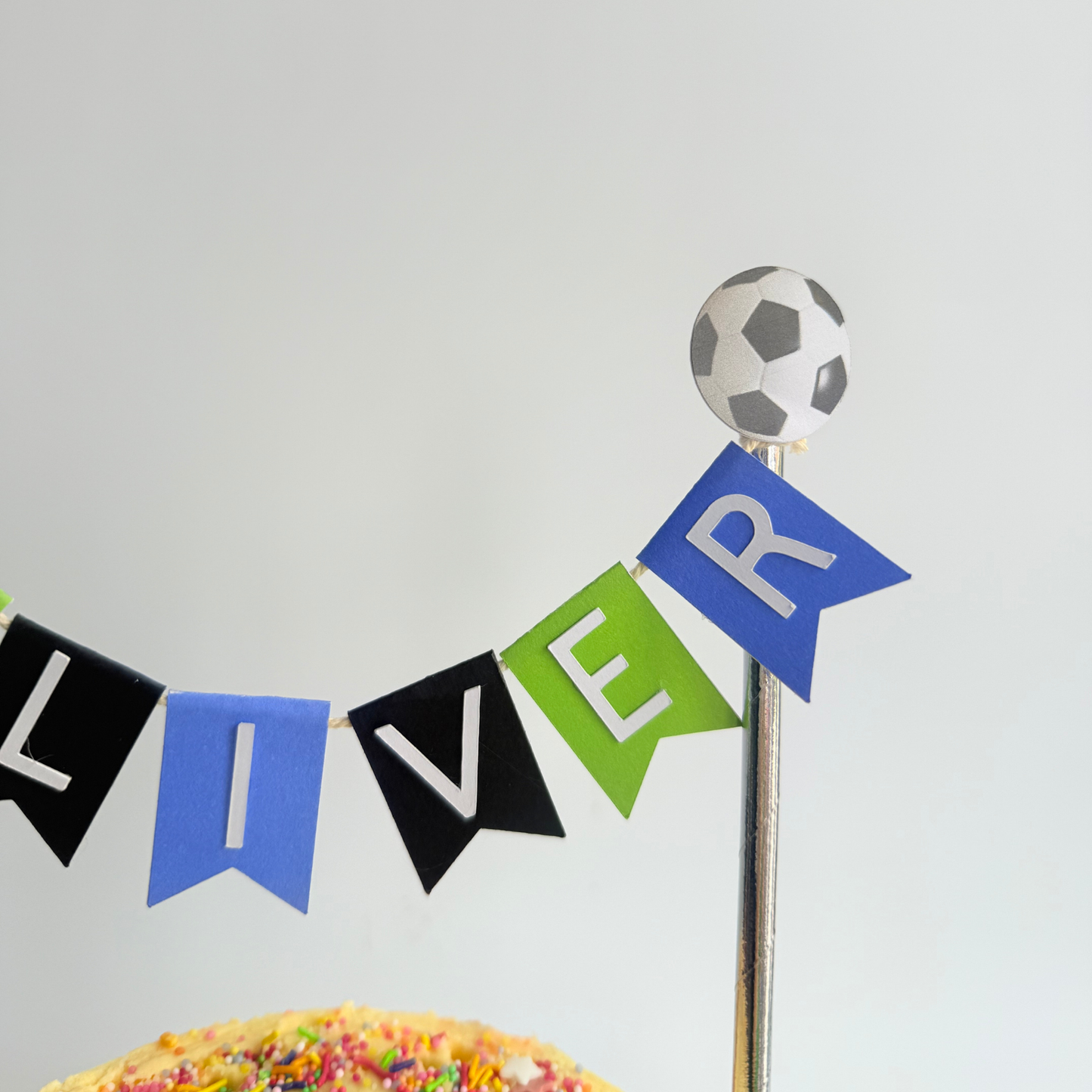 Handmade specially designed football cake decor, this cake topper is completely personalised with name and birthday age, it featured with a mixed blue and green flags banner(each flag 3cm tall) with white card cutout name letters(2.5cm tall), and football t shirt+football on top of each side, sit on silver paper straws.