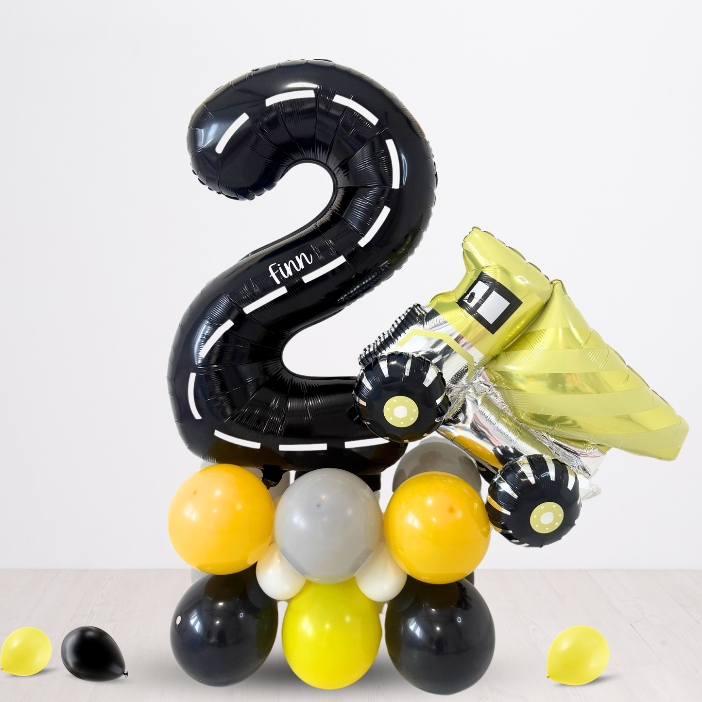 Personalised black yellow Car Vehicle diggers Birthday Balloon Bouquet stand