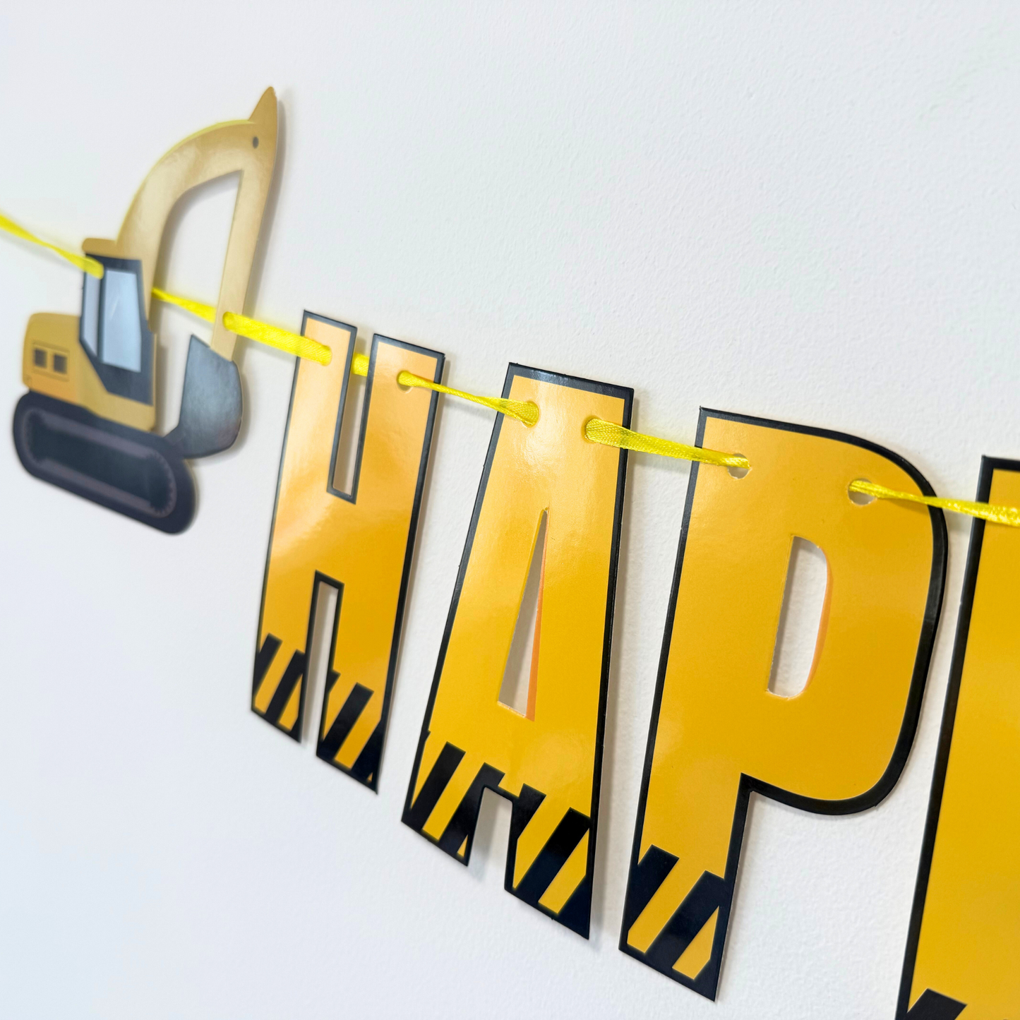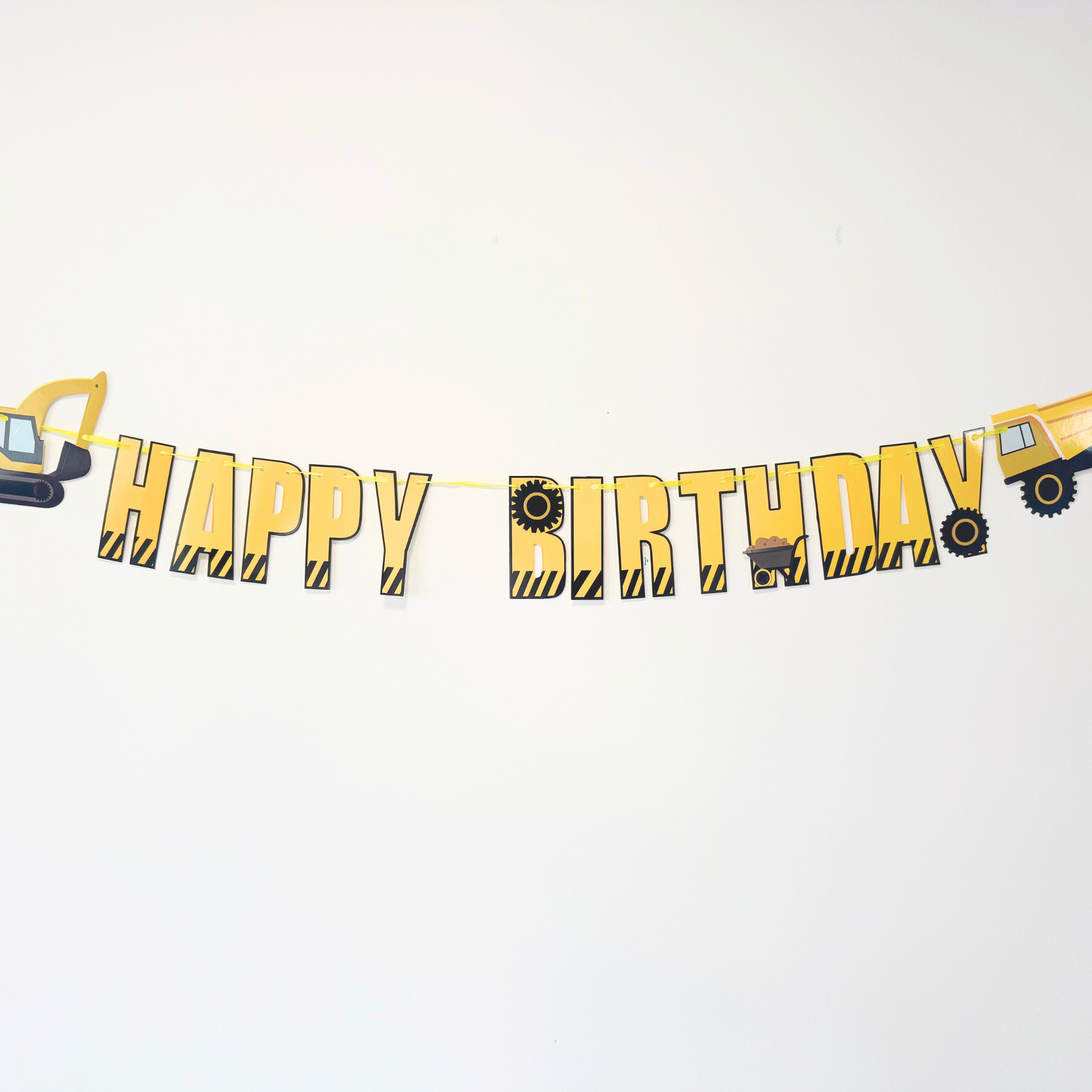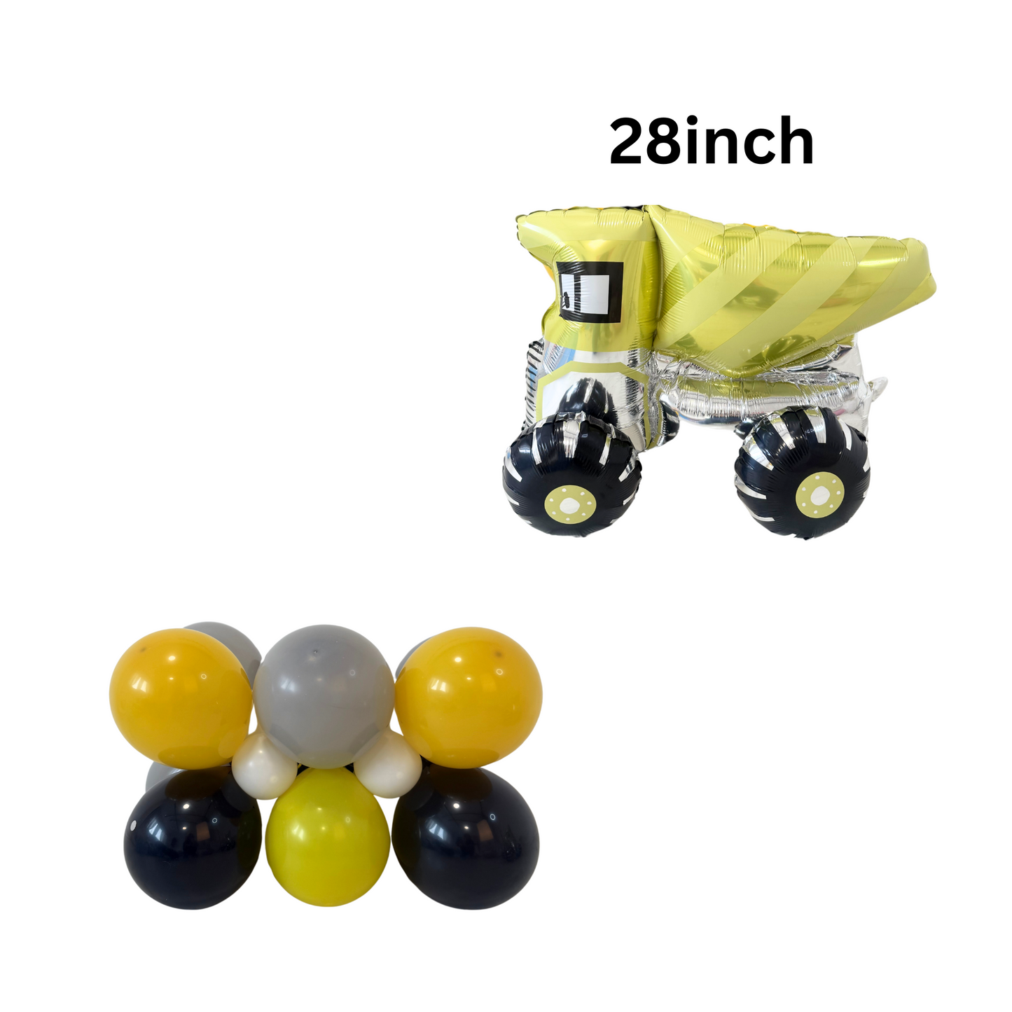Digger pack includes: 12-pack 12" latex balloons in mustard yellow and black, 8-pack 5inch balloons, 1-pack 40" black number balloon, 5-pack 5" mixed black and yellow balloon, 1-pack digger balloon, balloon glue dots, balloon ribbon.