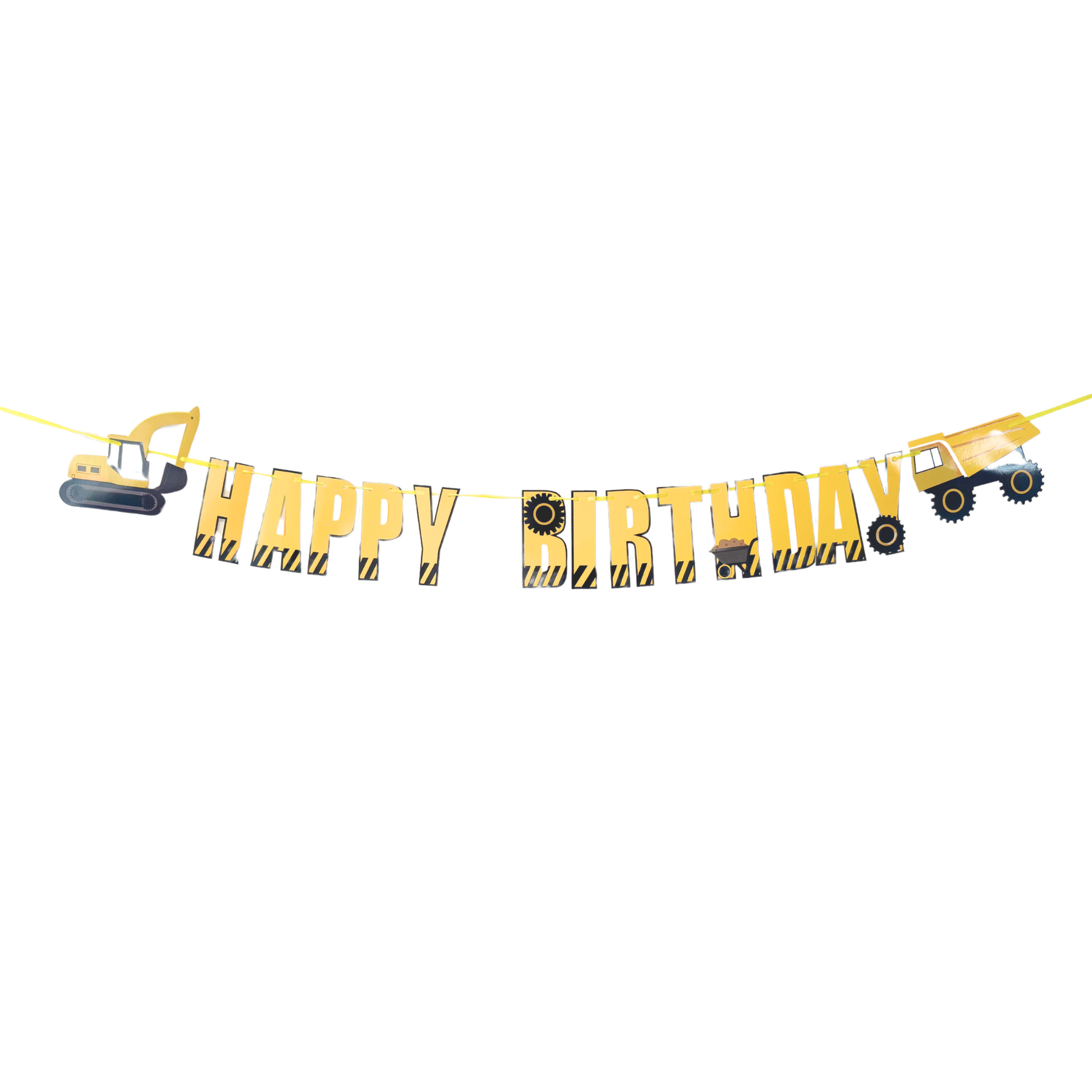 Digger pack includes: 12-pack 12" latex balloons in mustard yellow and black, 8-pack 5inch balloons, 1-pack 40" black number balloon, 5-pack 5" mixed black and yellow balloon, 1-pack digger balloon, balloon glue dots, balloon ribbon.