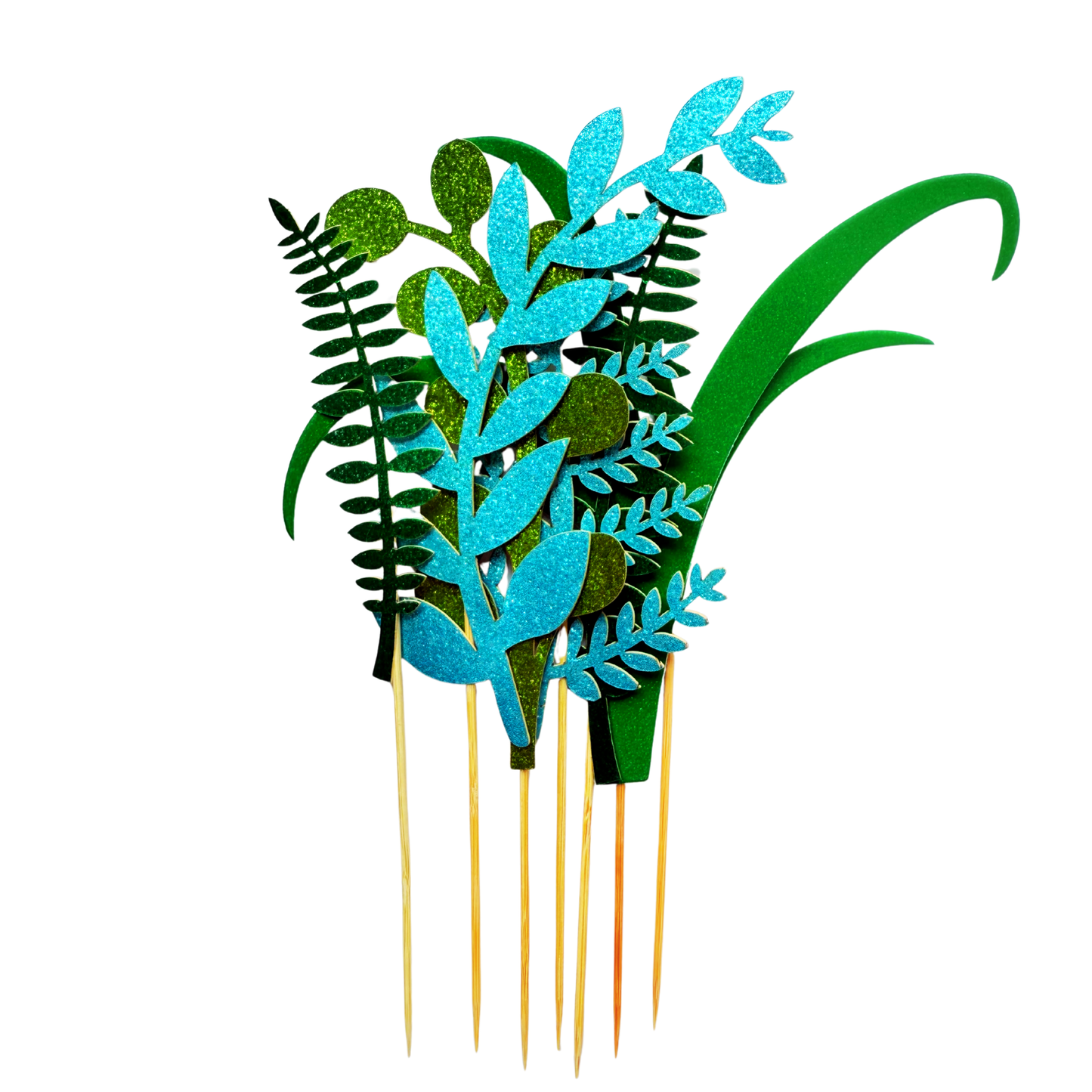 Pink purple orange clay Dinosaurs tropical glittery leaves Cake Topper set