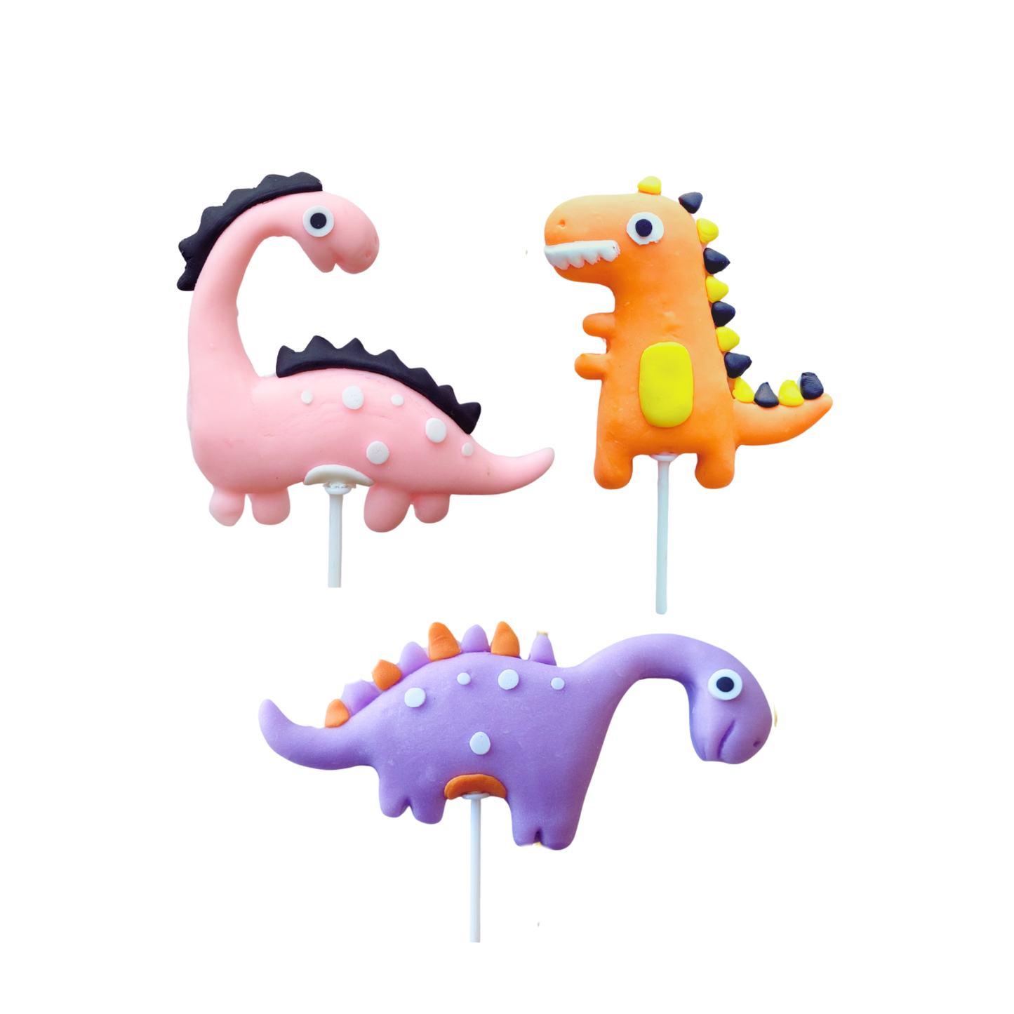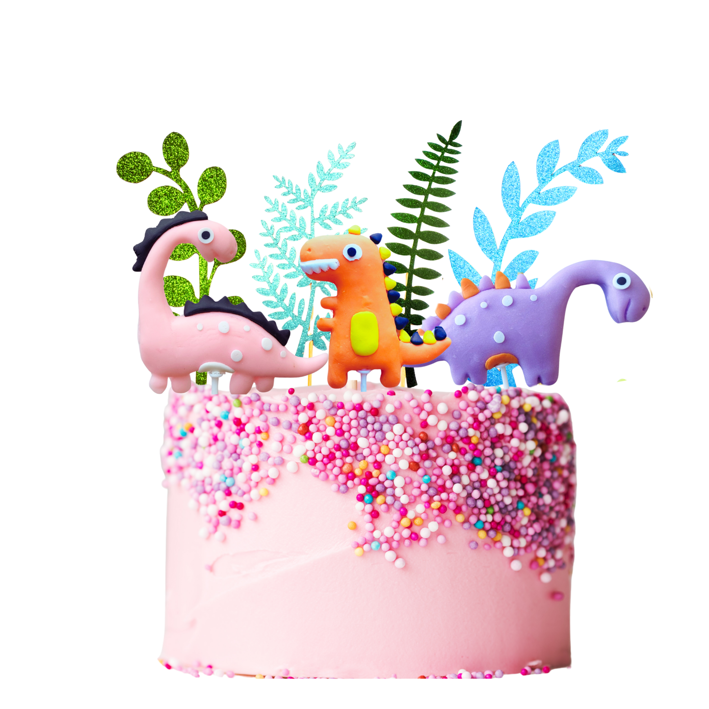 Very Cute pink dinosaur and leaves cake toppers, make a great fun cake by saving time, hand made and reusable. Cake toppers are presented on 6" round cake.