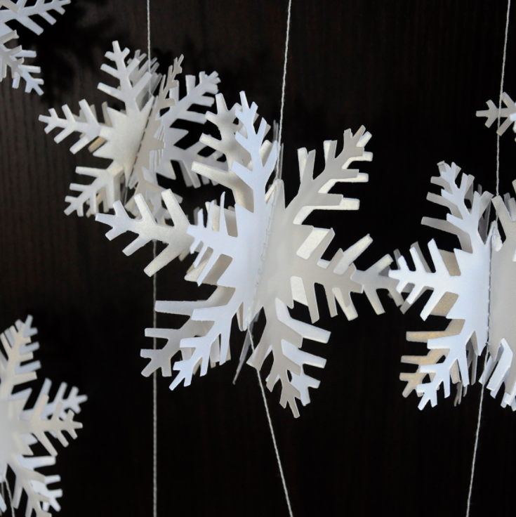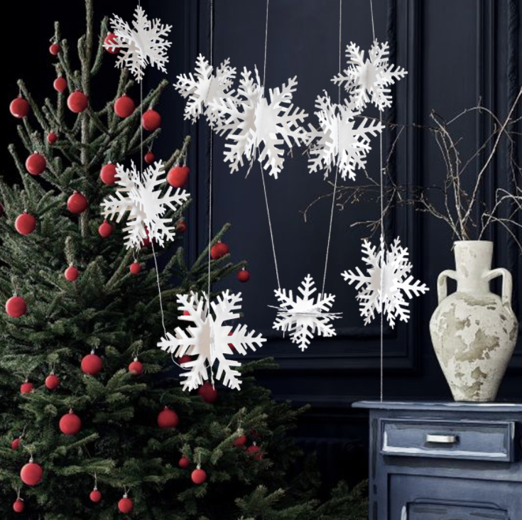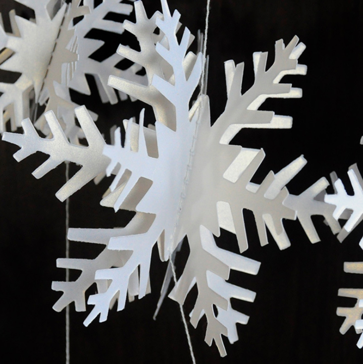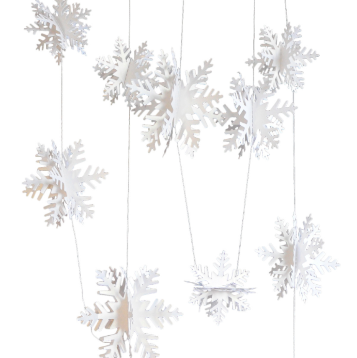 3-meter length, made of 80g paper card 3D snow flakes. 100% reusable, 12 pieces in 3 different sizes.