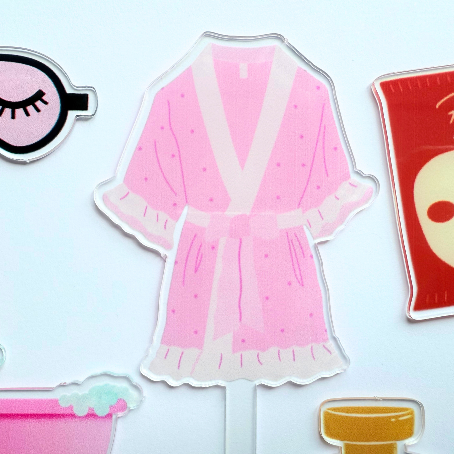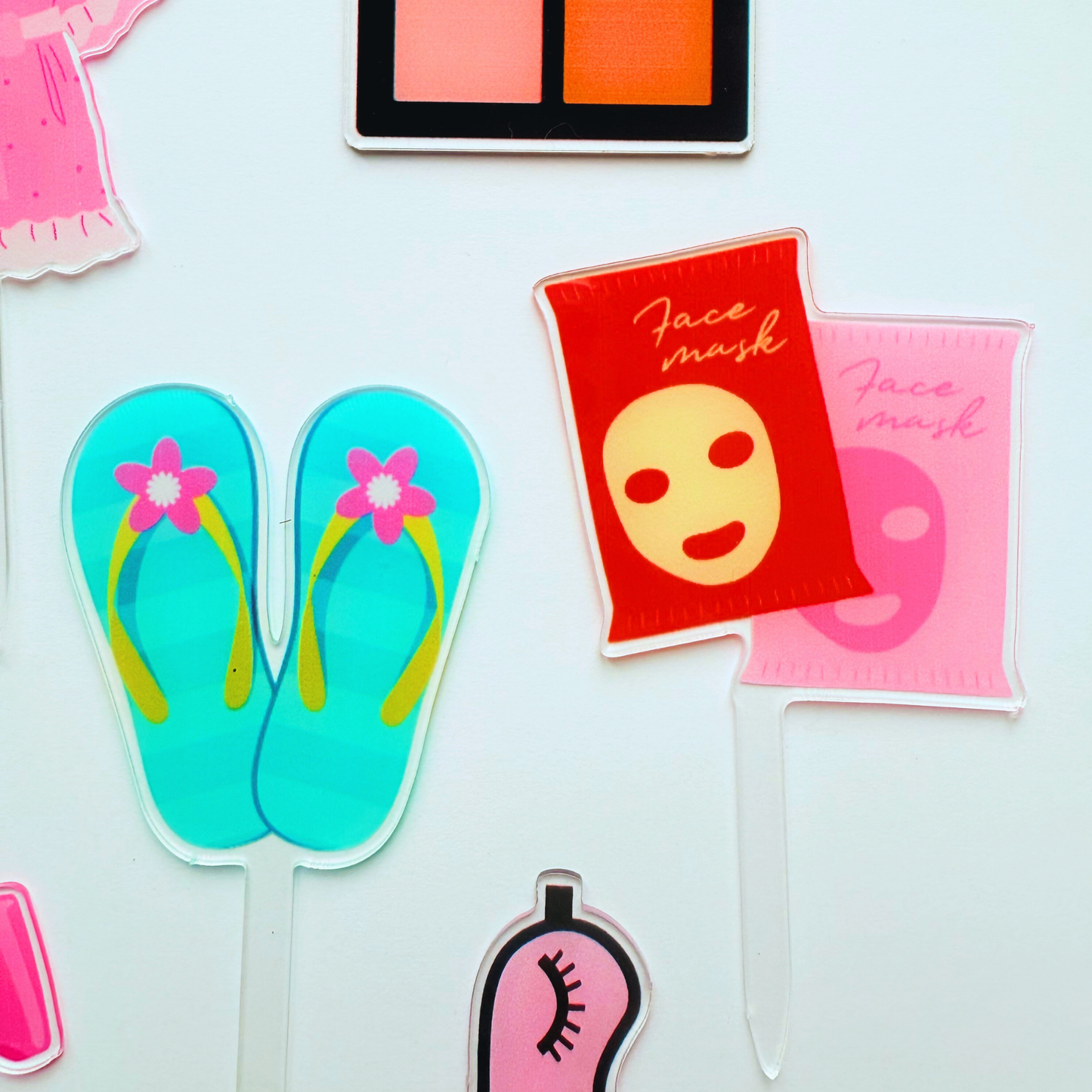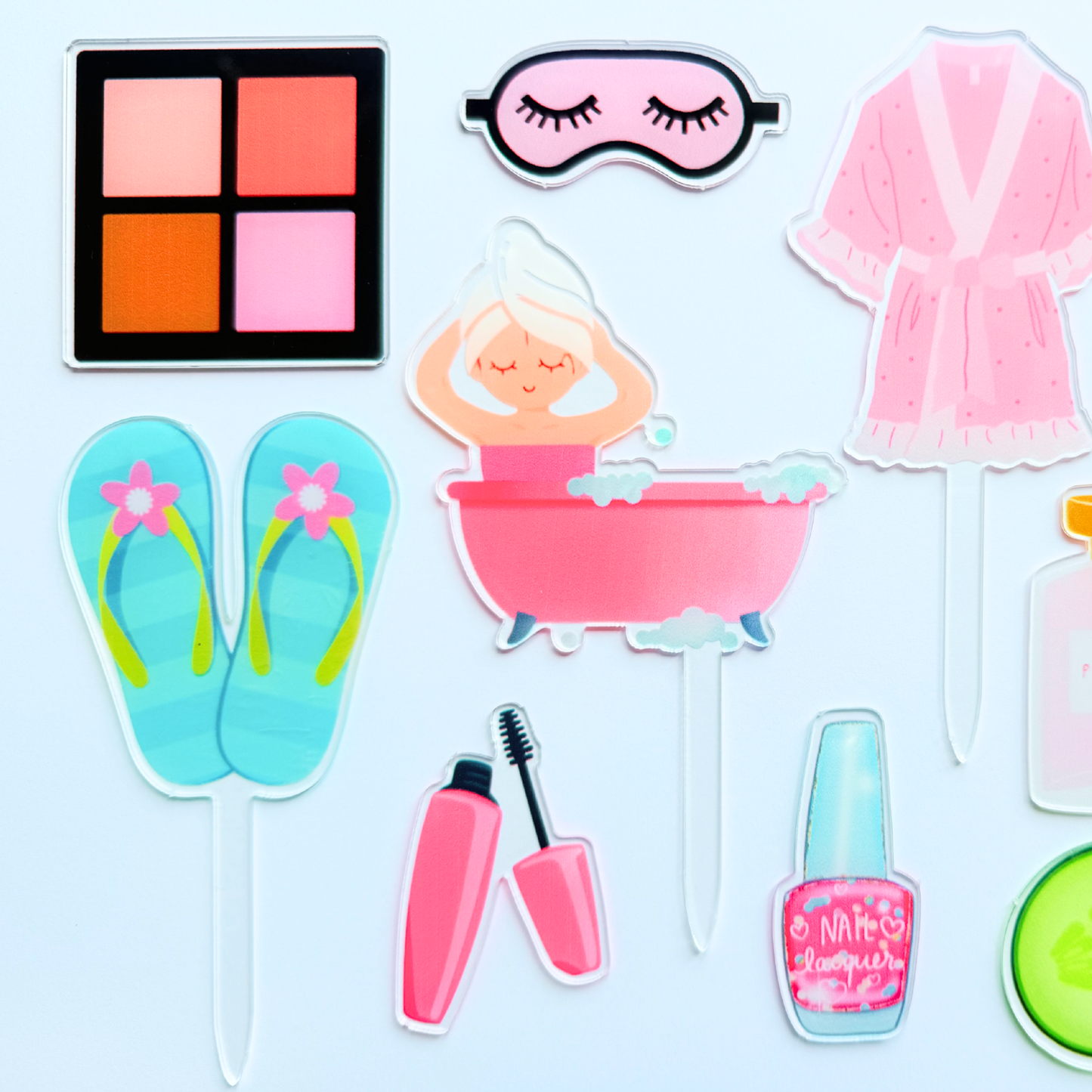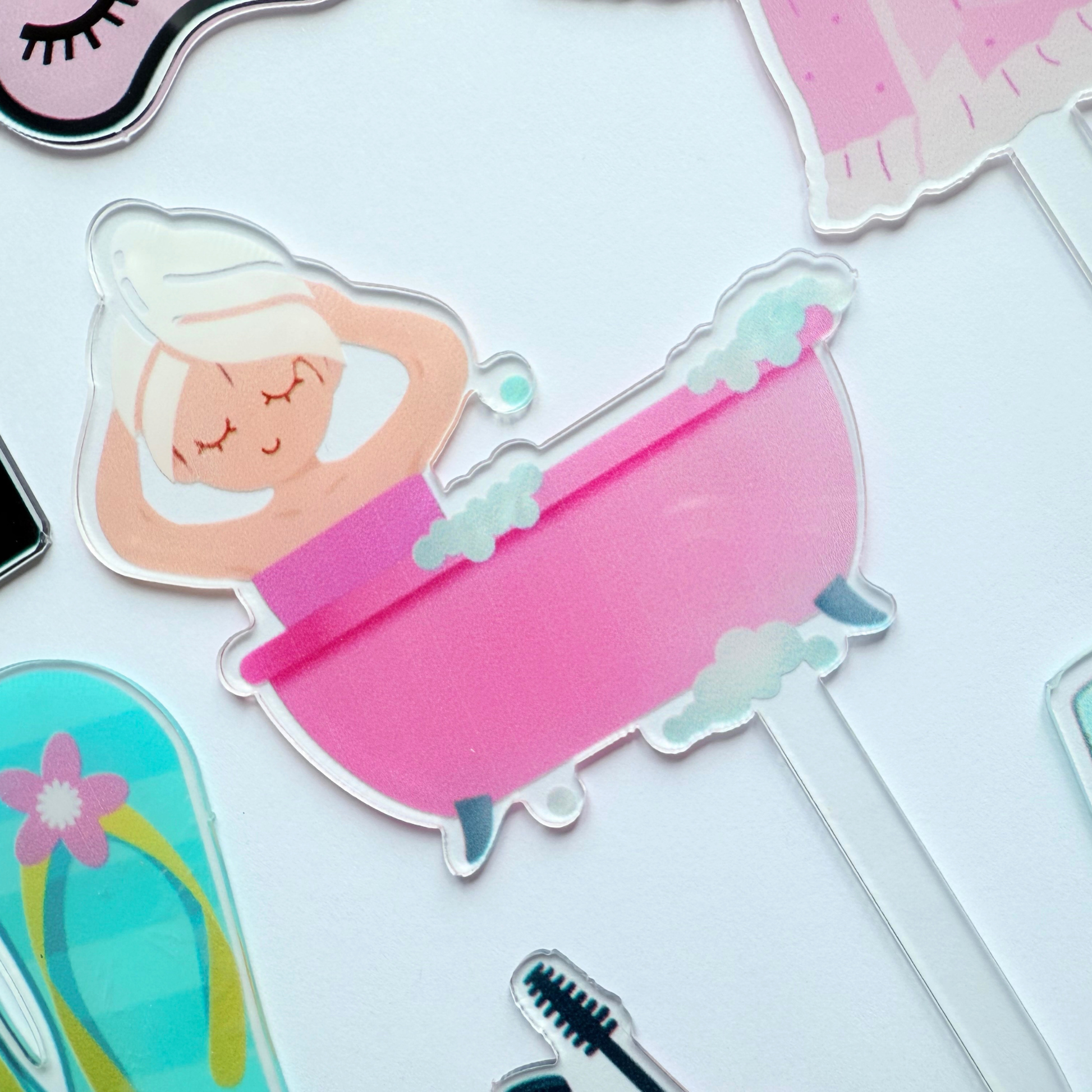 🛁 Includes 12 acrylic toppers featuring: