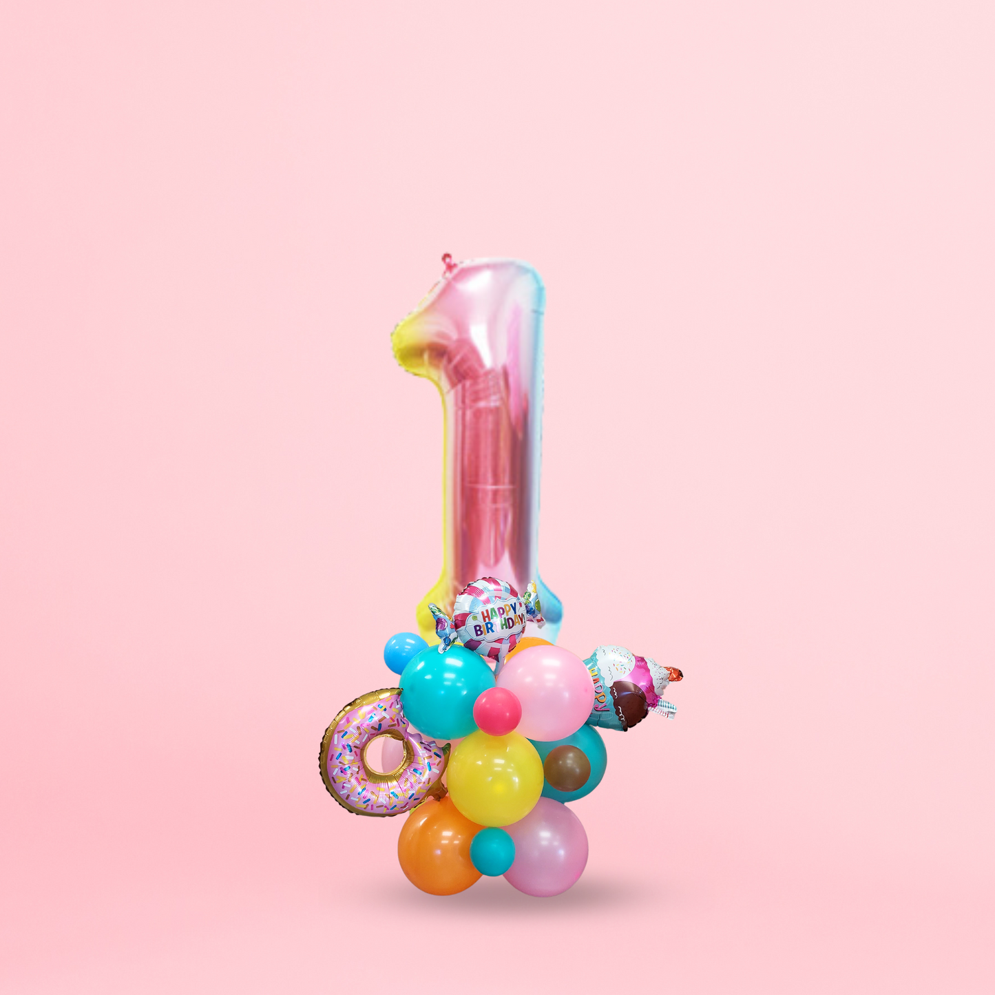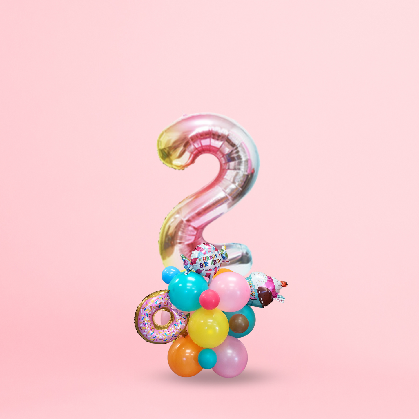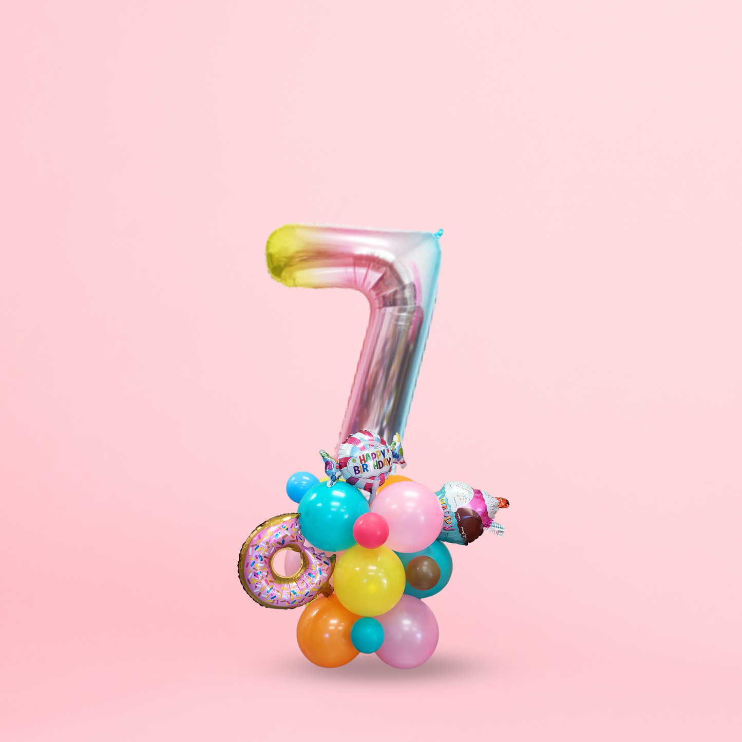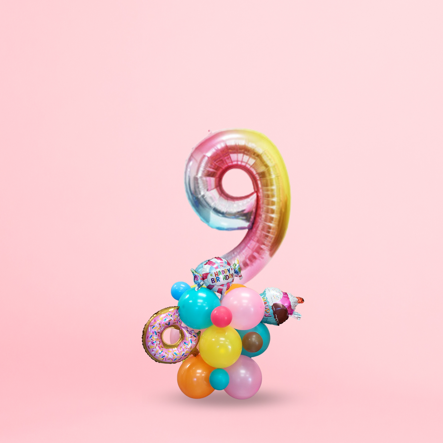 Instructions, 12PCs/ 12inch rainbow coloured latex balloon in pink, orange, aqua and yellow, 4PCs 5inch balloon in chocolate, magenta blue and aqua, 3PCs small foil balloon in style of ice cream, candy and donut, 1PC 40inch iridescent number balloon, balloon glue dots, ribbon, straw.