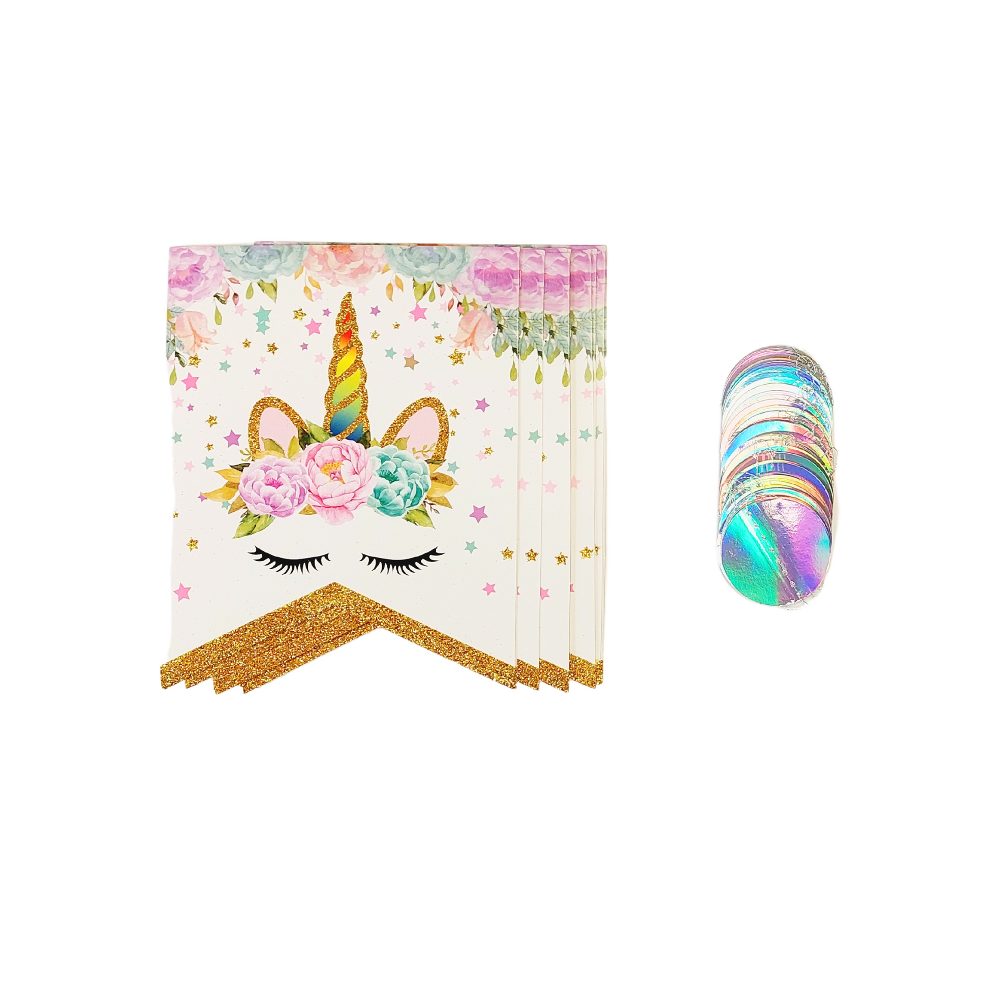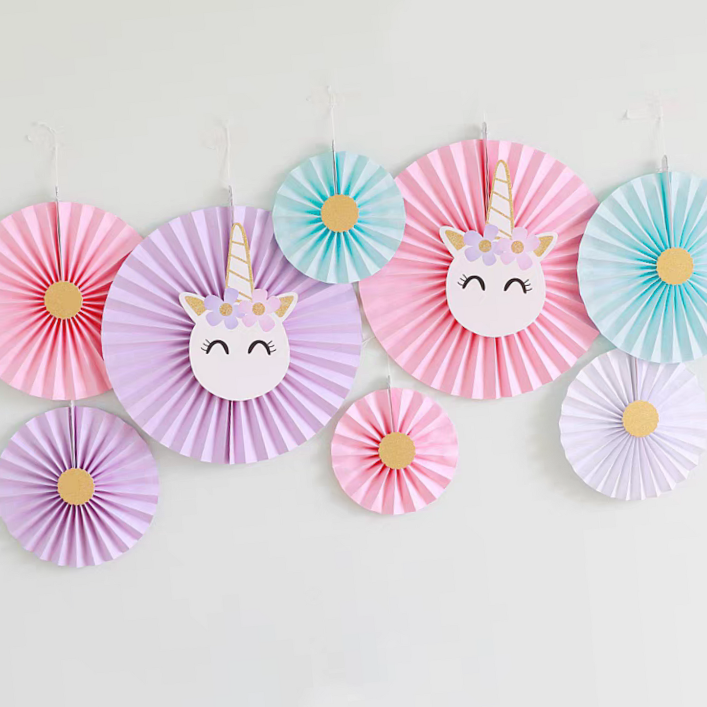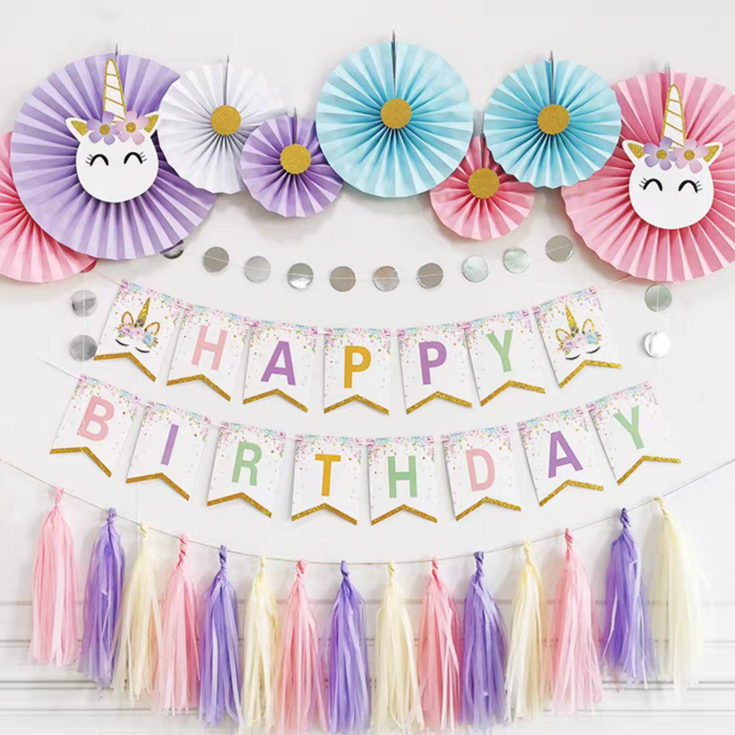 8-pack unicorn paper fan, 1-pack 3 meters length circle flakes bunting, 1-pack happy birthday banner, and 1-pack tissue tassel bunting garland, altogether make a special display for a magical unicorn birthday decoration.